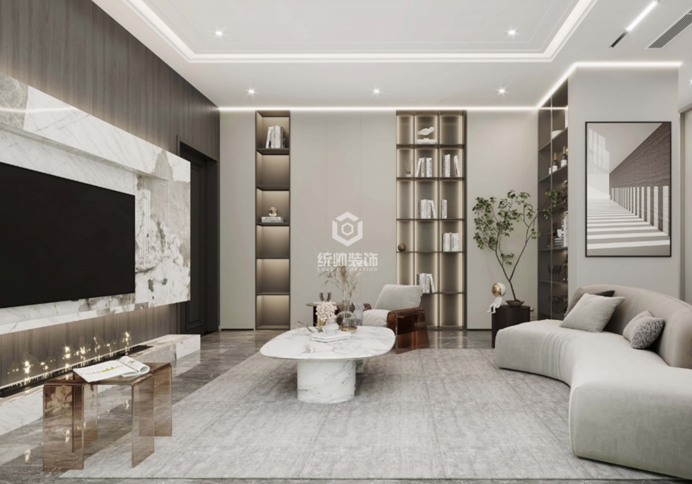 设计师潜心考究湾区居者的愉悦尺标,完成自然、空间与人的天作之合,演绎精英生活新逸境。 质感且具曲线感的家具配和丝感或绒布质感的布艺面料, 在比例、情绪和故事间平衡出了自由生动的韵味,处处贯穿恬逸和谐。 承湾居之美,显山海之韵,对于精英人士而言,不止是蕴含智慧的品质环境,更是聚焦幸福的生活方式范本。 设计就是着重于点、线、面的灵活运用,把整个环境营造出家的温馨。