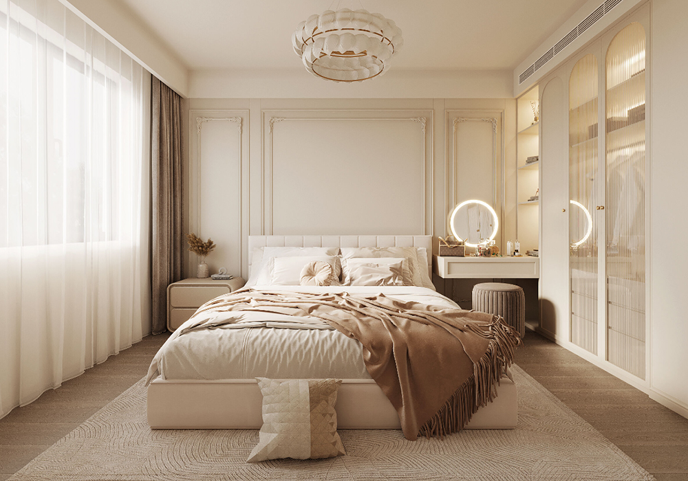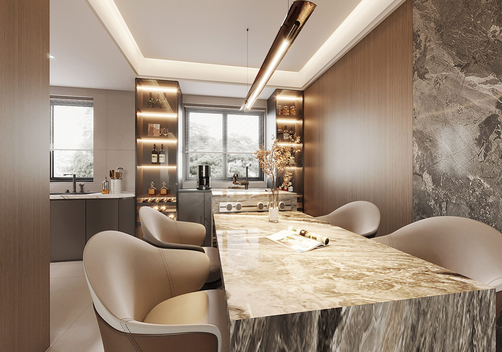 整个空间极度舒适,功能配套齐全,比较规整,很干净的感觉; 1.厨房和客餐厅一体化,增强南北采光以及通透性。 2.开放式厨房一体化设计; 3.厨房和客厅之间加了一个岛台; 4.主卧及卫生间斜角设计,合理化运用空间,增加储物空间; 5.女儿房设计了衣柜和书桌一体设计,更好的拿取东西; 6.多功能房增加了临时住人和储物功能。
