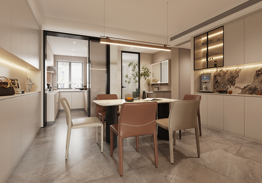 原有户型是阳台与次卧一体,客厅为东西方向,量房当天设计师就和业主沟通现有客餐厅比较昏暗,房型没有南北通透感,现场建议将南次卧改为客厅,现有客厅位置改为次卧室,这样南北就比较通透,从光源,动线,布局做整体调整,客户思路瞬间打开,在方案上得到认可。现已有进门鞋柜在南次卧那面墙,家里鞋柜储物功能较少,在前期方案上将进门餐厅整面墙做为鞋柜,增加鞋柜的储物功能,餐厅还单独增加酒柜玄关,业主进门就能看到家里酒柜端景,在下班回家第一眼就能得到放松,使人心情愉悦。