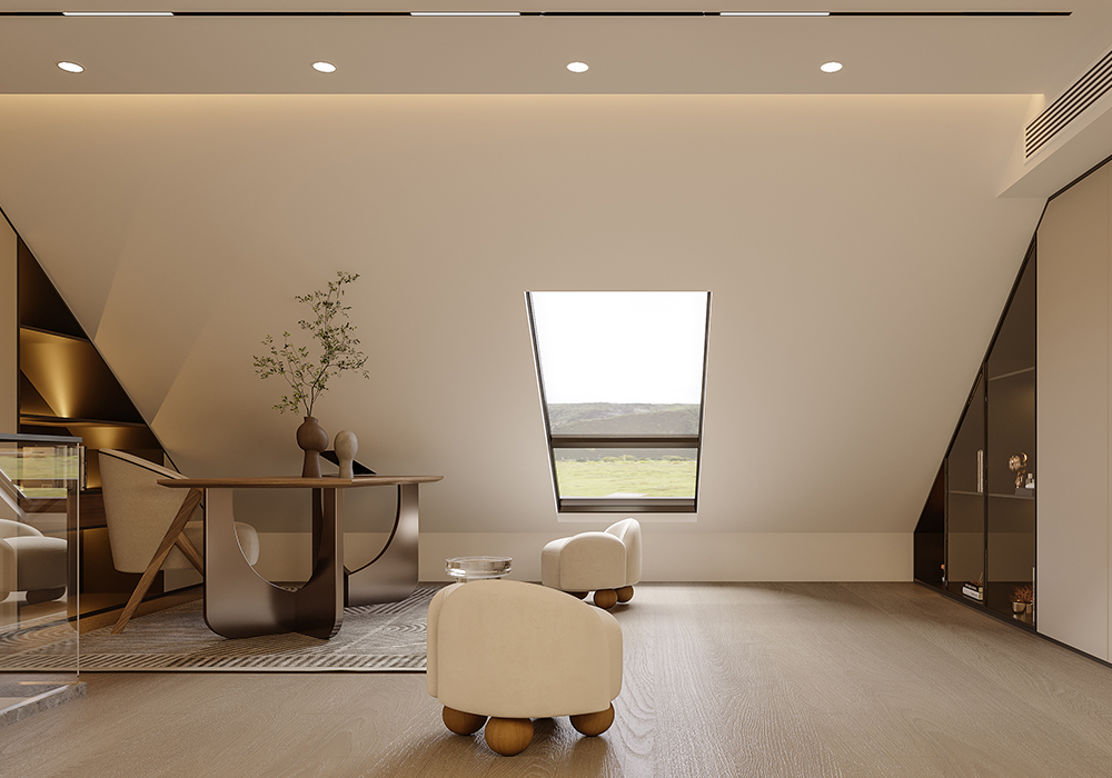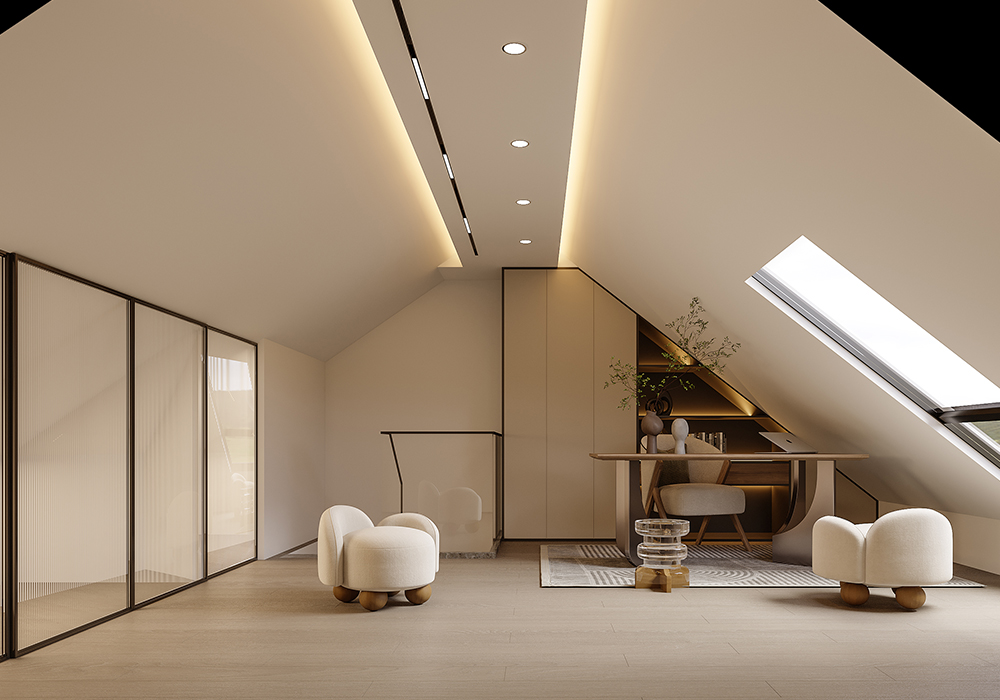 房屋有三层,一层为生活活动层~待客、聚会;二层为家人居住层~安静、私密性保障;三层~阁楼为收纳、办公层;一楼客厅与阳台的连通和二楼公子的房间与阳台的连通,既提升了空间使用率,又扩展了空间感,增加通透性,让空间更开阔;家政区安放在居住层的北露台,便于洗衣晾晒。