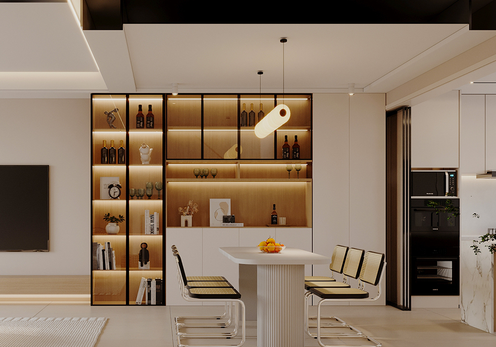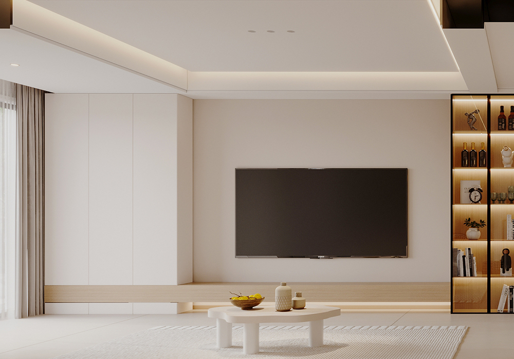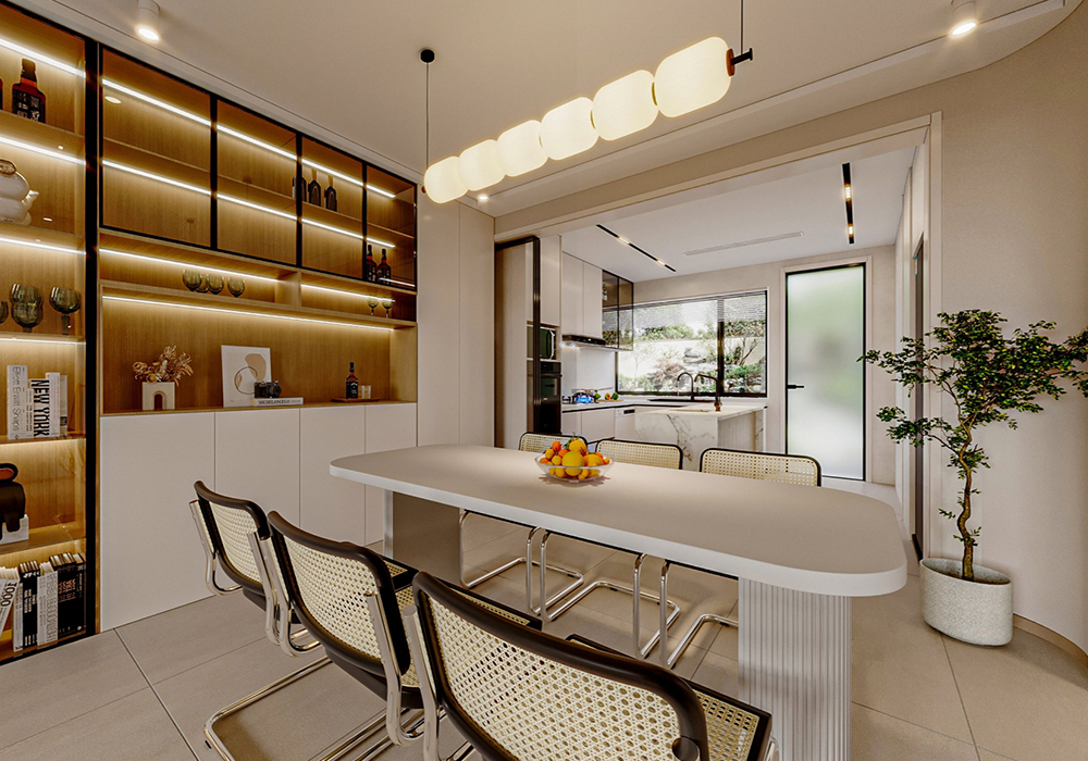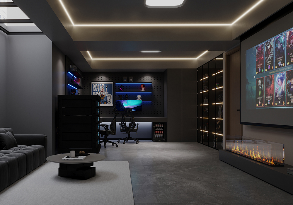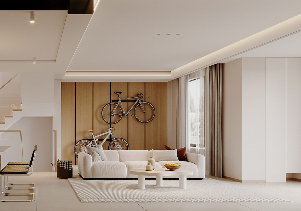 房屋主要的设计风格以奶油风为主,用自然材质和简洁的色调来营造空间的温暖自然的质感,让温柔的色彩营造舒适自由的居心之所。 ●地下室是业主平时打游戏做手工和看电影的休闲场所,黑色的科技感给顾客沉浸的电子体验。 ●一楼客餐厅打通,增强整体的空间感与互动性。厨房L型的操作台动线流畅、操作便捷,定制整体橱柜既可享受烹饪的乐趣,又能兼具收纳功能。 在厨房还增加的一个岛台,早就了厨房的洄游动线,平时偶尔清洗蔬果,也是非常方便。因为业主夫妻两人都喜欢骑行,所以在沙发背景墙上摆放展示了两人的自行车。 ●二楼是两人的休息区,在主卧设计了足够多的衣帽柜,满足了业主的储物与衣物需求。面对主卧中特殊的水管,做了圆弧的处理。圆润的造型搭配空间中温暖舒适自然的颜色,给空间注入温馨感,打造柔和温暖又极具质感的卧室。