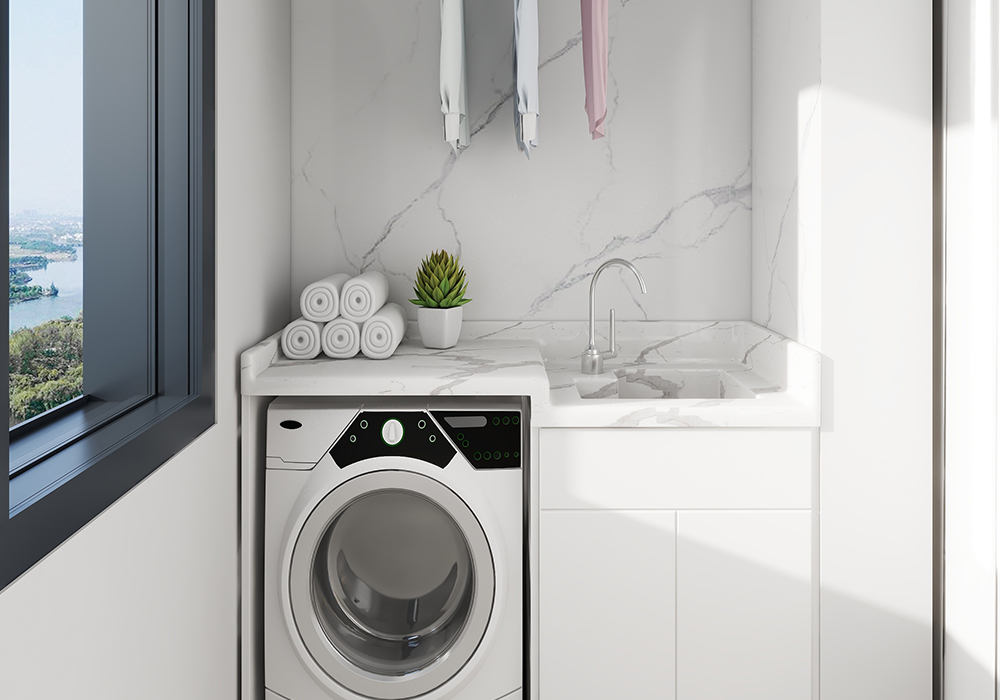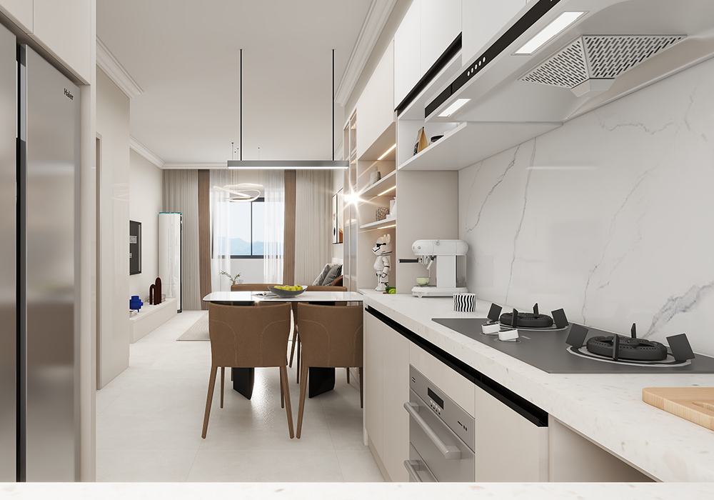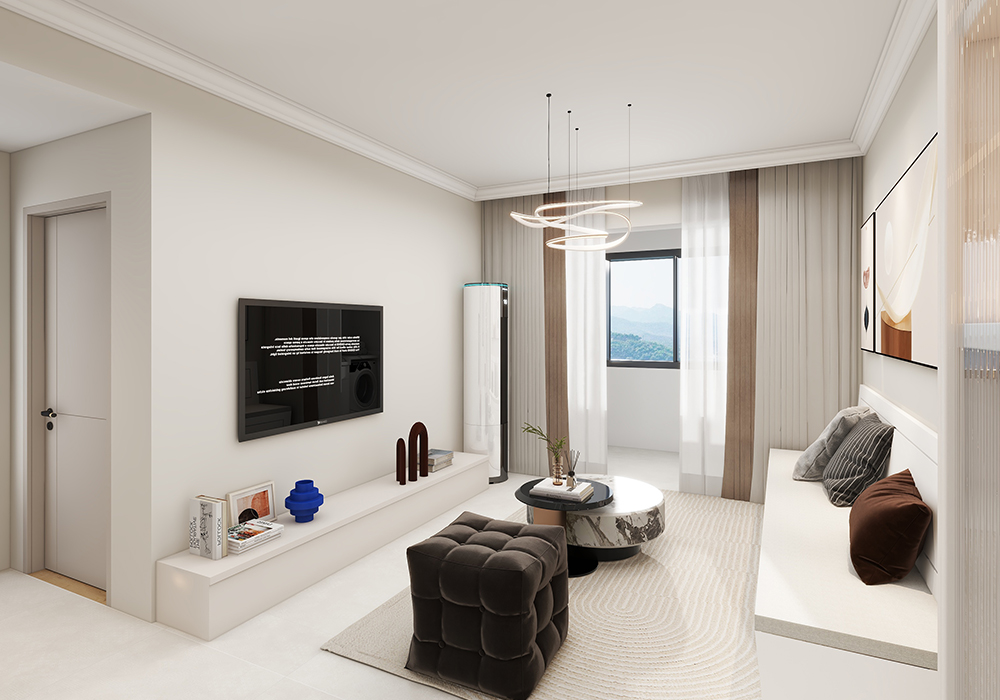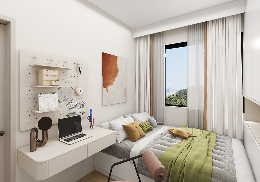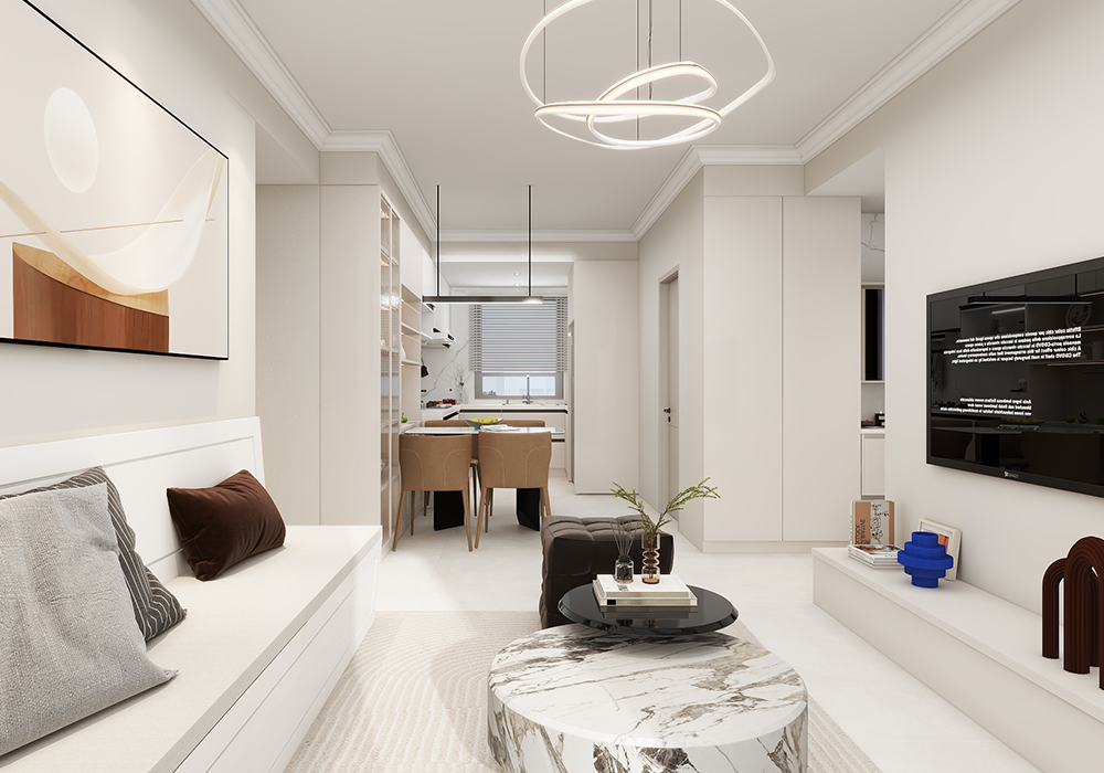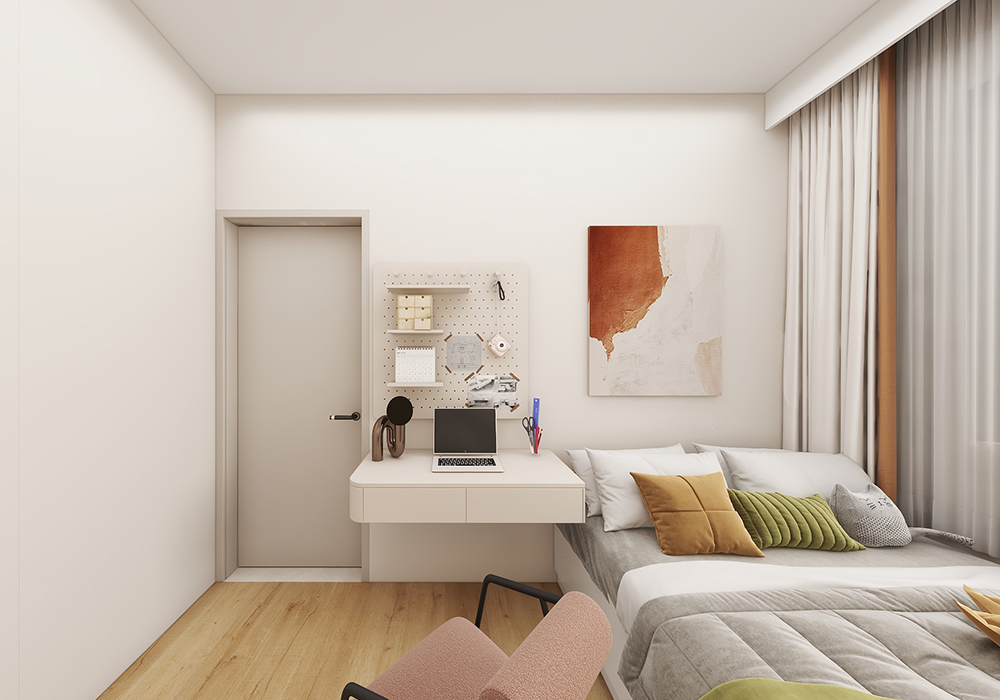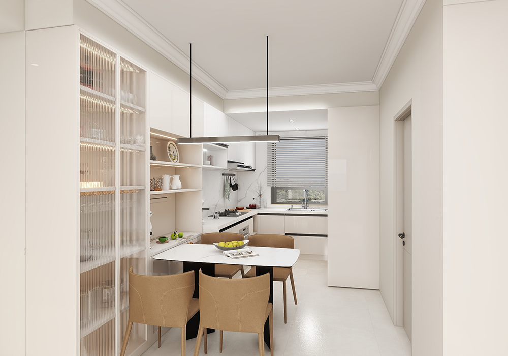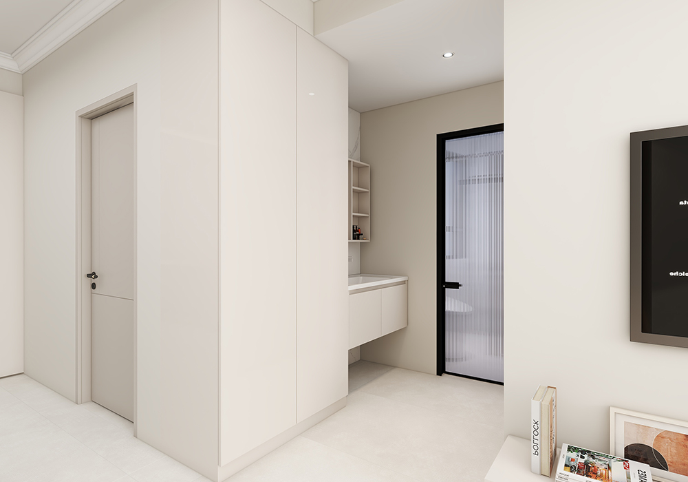 入户通过鞋柜,将视野进行部分遮挡;左手边便是主卧和次卧房;通过设计,将主卧室的套卫做成供南面两间卧室来使用,避免老人起夜时走太长的过道。右手边是餐岛一体的用餐空间和整墙的装饰柜及储物柜;客厅和阳台通过水吧台更好的衔接,使得客厅更加宽敞明亮,沙发后面的小吧台同时兼顾家庭休闲娱乐的功能;北面则是厨房和一个带翻板床的多功能房,也具备一个卫生间的功能。