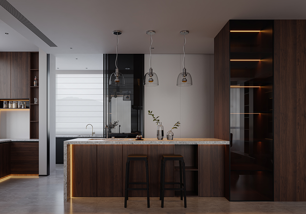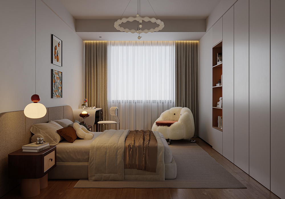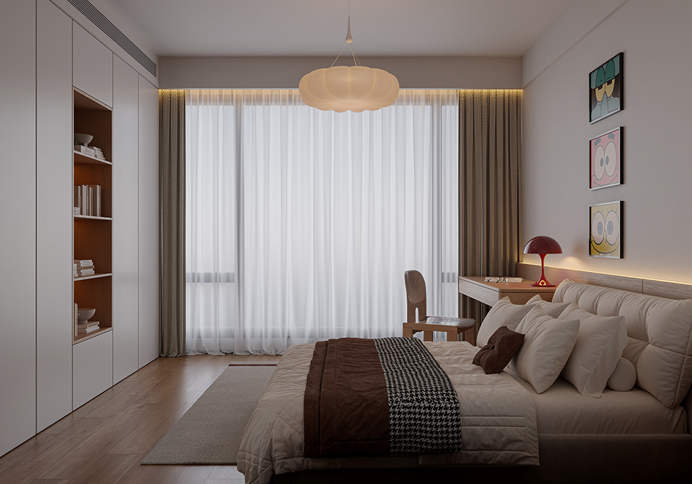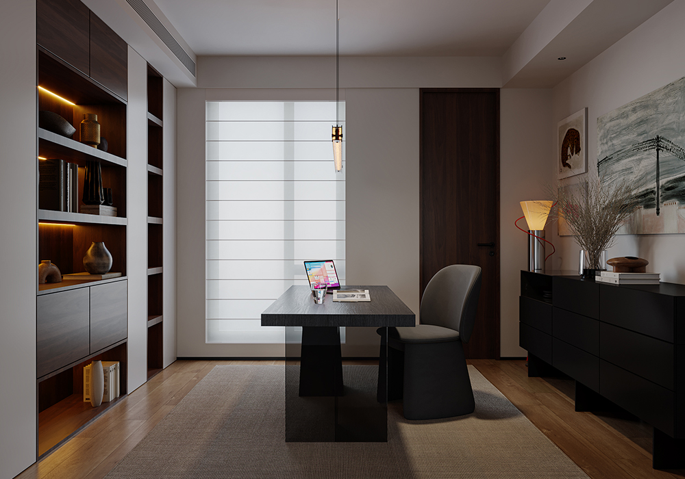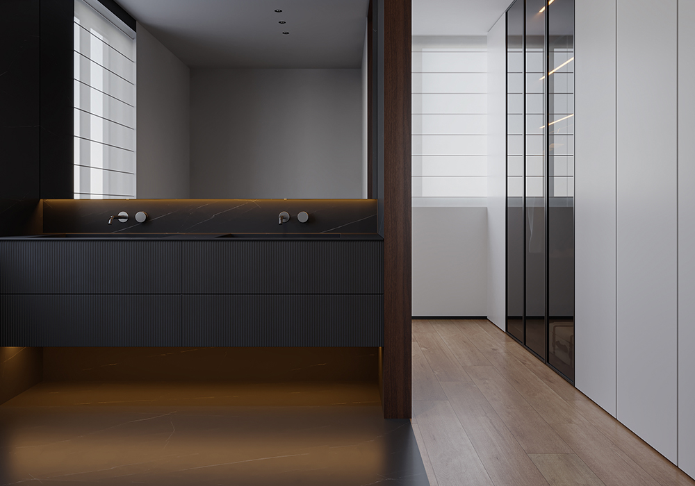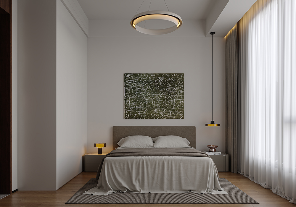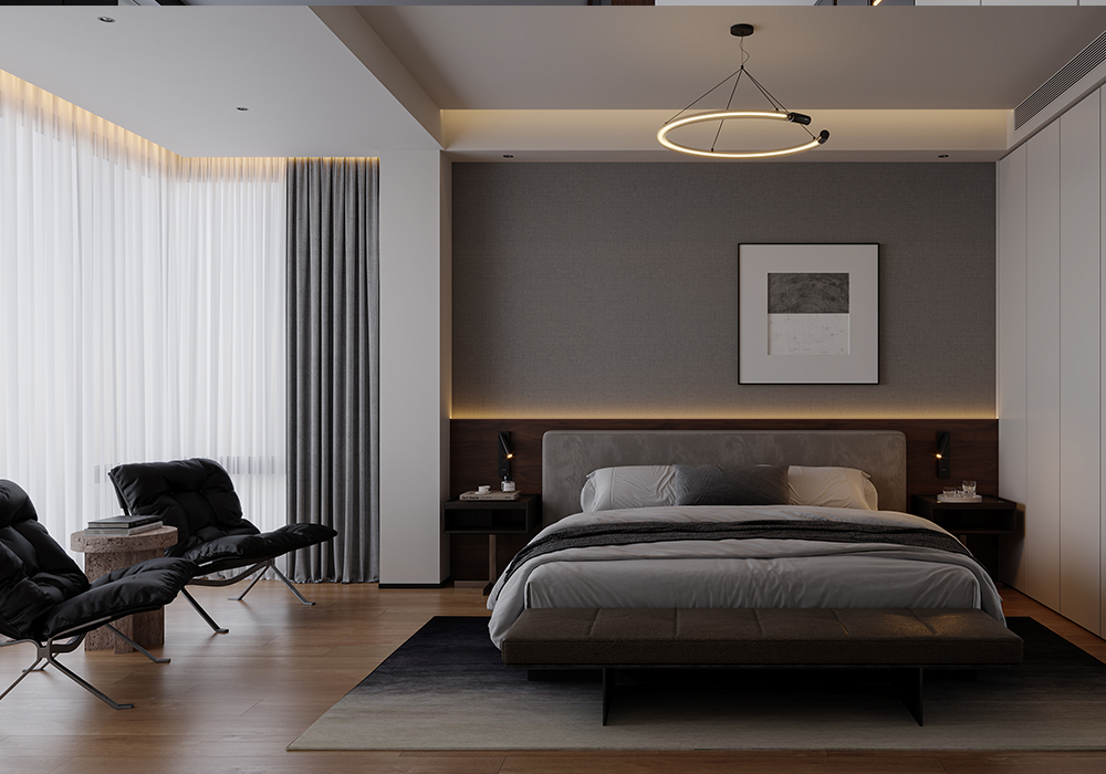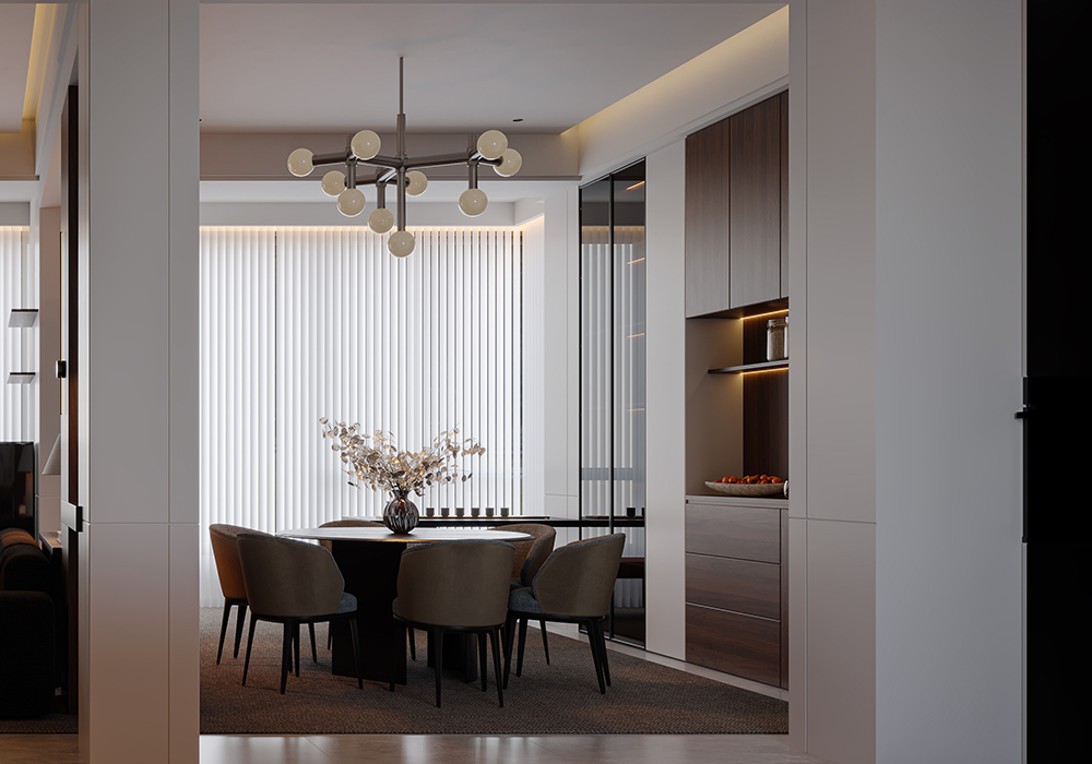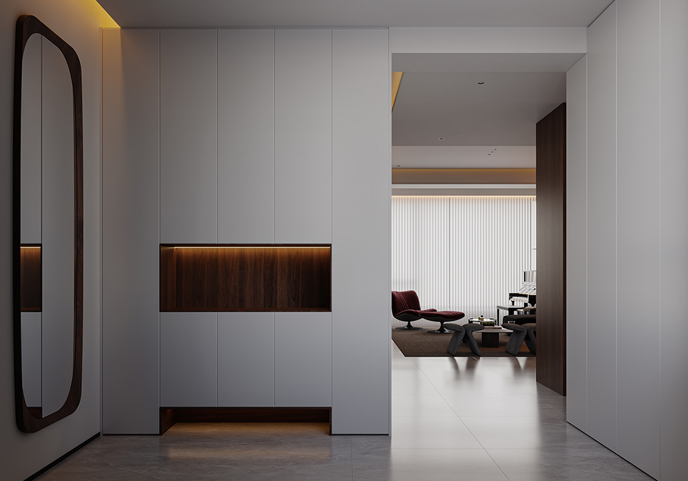 居所的美好,将人从喧嚣忙碌中带回身心松弛的氛围中,高级感,质感是品质住宅的追求。 在设计中,主要优化内外关系。尽可能把空间打开,消除区域之间的边界感,以通透开敞增强了动线的流畅性,让居住者在空间中有了更多可以停留、对话、观望的地方。 同时,隐藏在缝隙中的光线加深了空间的流动。 所有元素在开放式空间中都是流动的。在玄关的设计中,以顶光打断了空间的界限与闭塞感。 考虑到公共性与私密性的平衡,以及生活方式与多元场景的融合,在梳理动线和布局后,将一层作为公共休闲区,二层用来作为私享生活区,并为未来的可变性预留出更改余地。 每一间卧室,将采光、功能与审美完美融合,呈现出简洁干净的设计感。