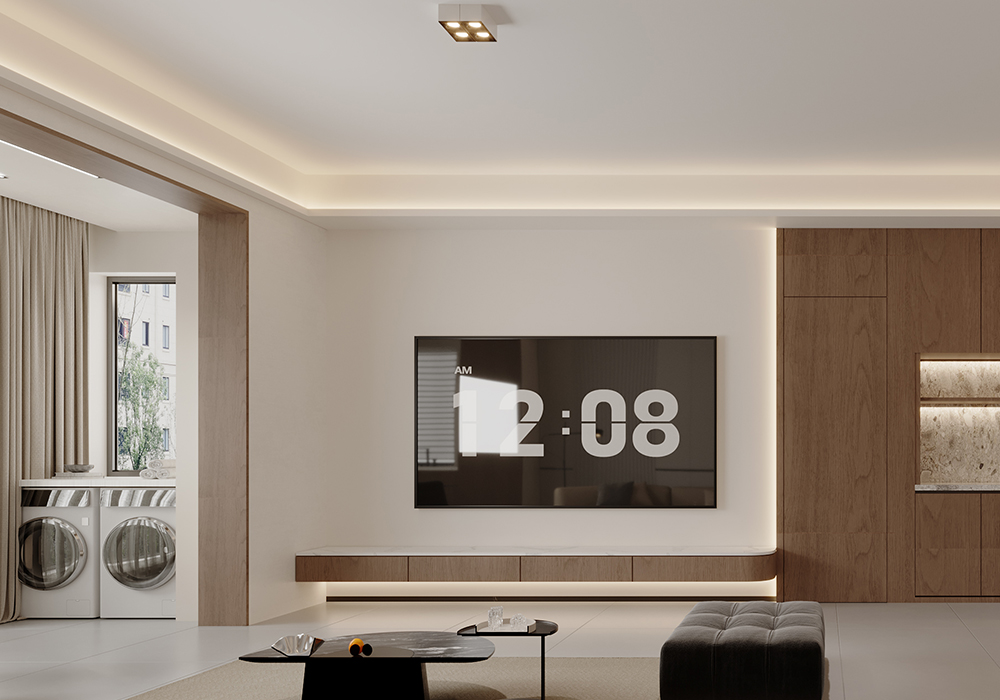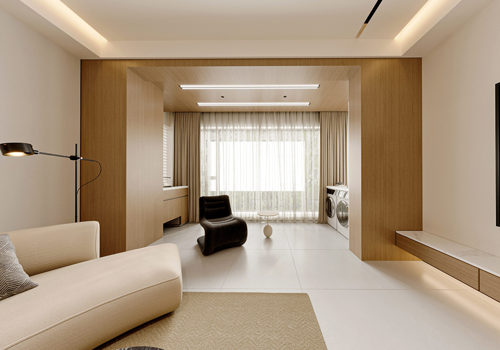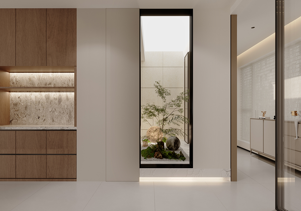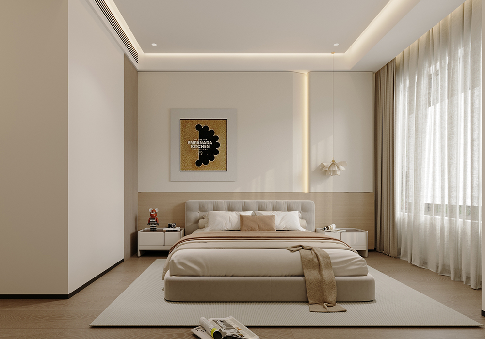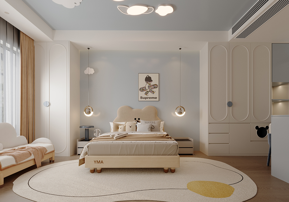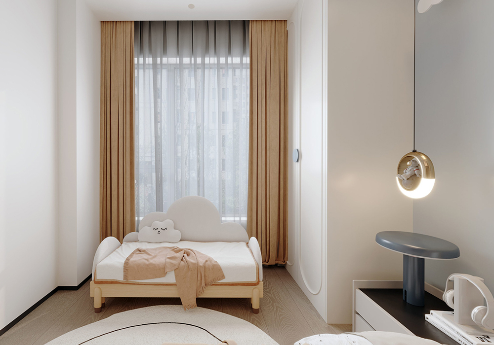 本案例为温暖治愈的奶油风格,整体空间以大面积奶油白进行渲染,搭配上木制元素和棉绒装饰物,营造简约舒适的生活氛围,多处向阳窗让温暖慢慢流淌到每一处,保留生活最轻松纯粹的感觉。 踏入室内,原木+奶油的配色基调,勾勒出温暖治愈的氛围,纯色背景墙沾染颜色鲜艳的装饰画,简单的元素也能带来高级的美感,简约低调的米色沙发辅以深色系的单椅,给整个空间增添了轻松活泼的感觉。 阳台作为平时的晾晒与洗衣区,用木质包裹的独特空间,给与了这个空间更为特别的空间感,并且这种木质材质不仅装饰了阳台,同时也点缀了客厅的各处空间。给整个空间带来了更多的自然感受,与入户处的室内庭院交相辉映,相互融合,相互照应。 客厅旁边便是餐厅,一开门便是幸福的气息,厨房边设置了一个小岛台,平时即可以作为烹饪时的台面,闲暇之余也是夫妻二人就餐喝茶闲谈之所,并且此处的设计可以舒适完整的欣赏到室内庭院的美景。 主卧的空间很大,为了满足业主足够的储物需求,设计了一整面的衣柜,米色的墙面搭配木饰面的床背,搭配墙面上的嵌入灯光,空间内的各个元素,使得人进入空间内便是放松,惬意的。 女儿房则加入了更多的色彩元素,彩色的元素搭配特别的图案,一个充满童趣的空间便是如此。