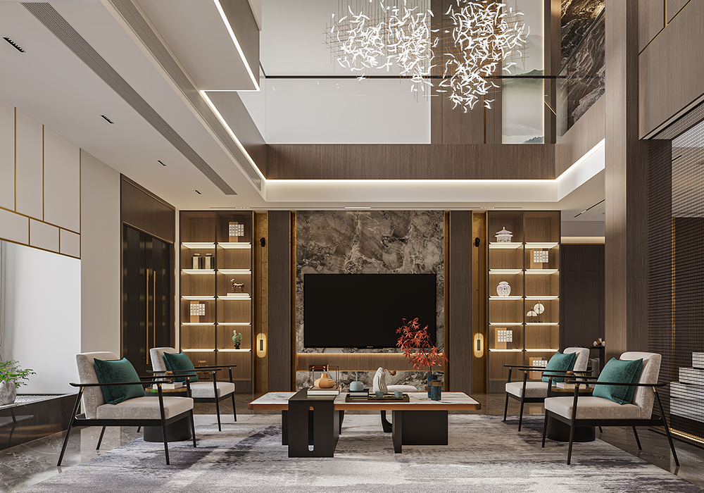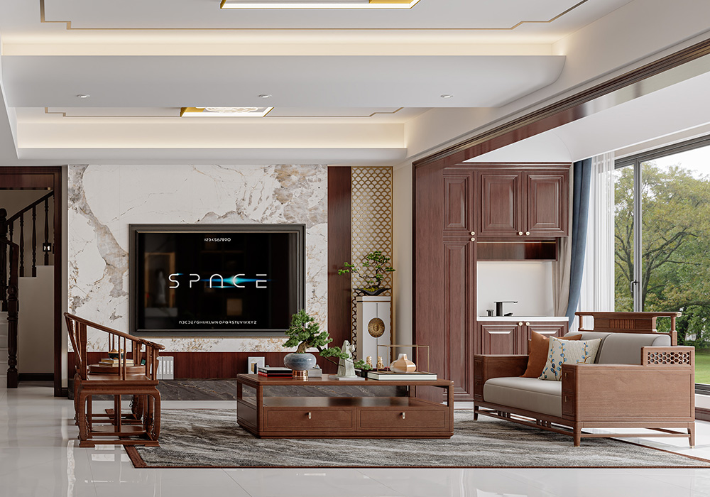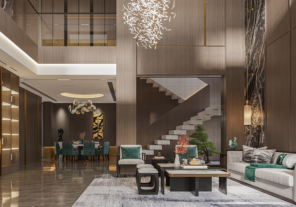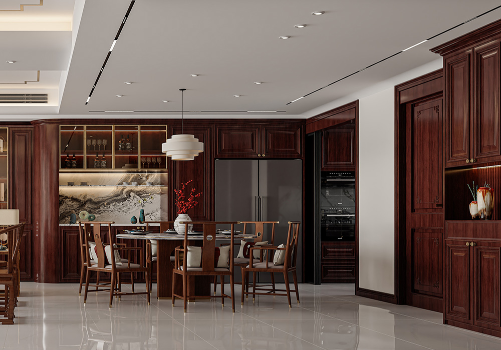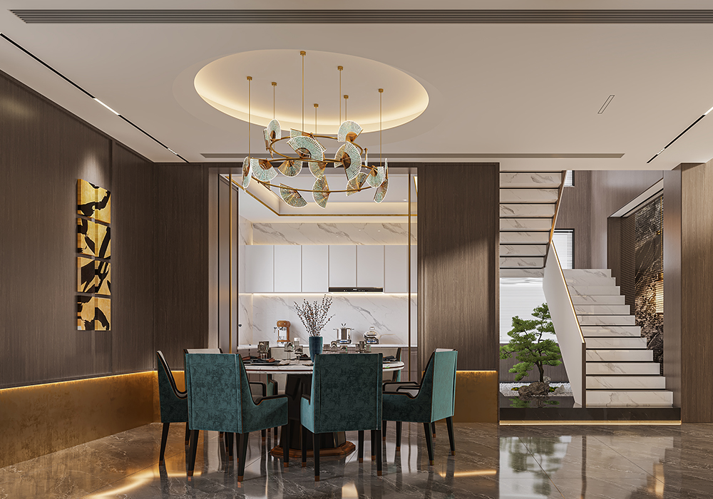 整体按宋氏美学风格设计,挑空的客厅加上大理石的背景墙,以及胡桃木的护墙板 ,让整个家,更温馨,餐厅的圆桌设计也象征这家庭的美满生活。