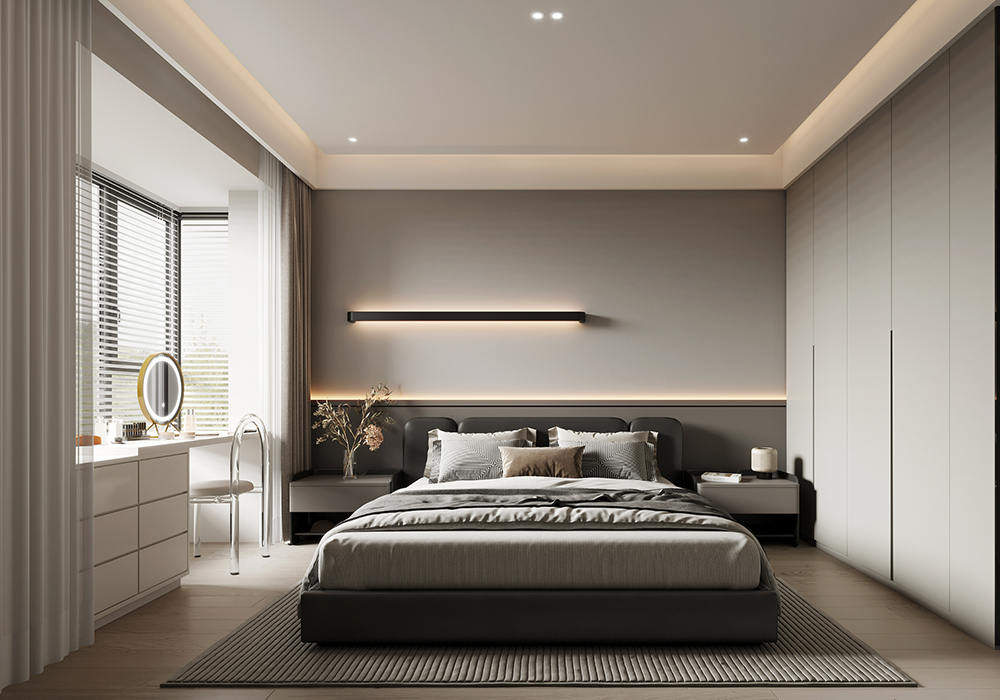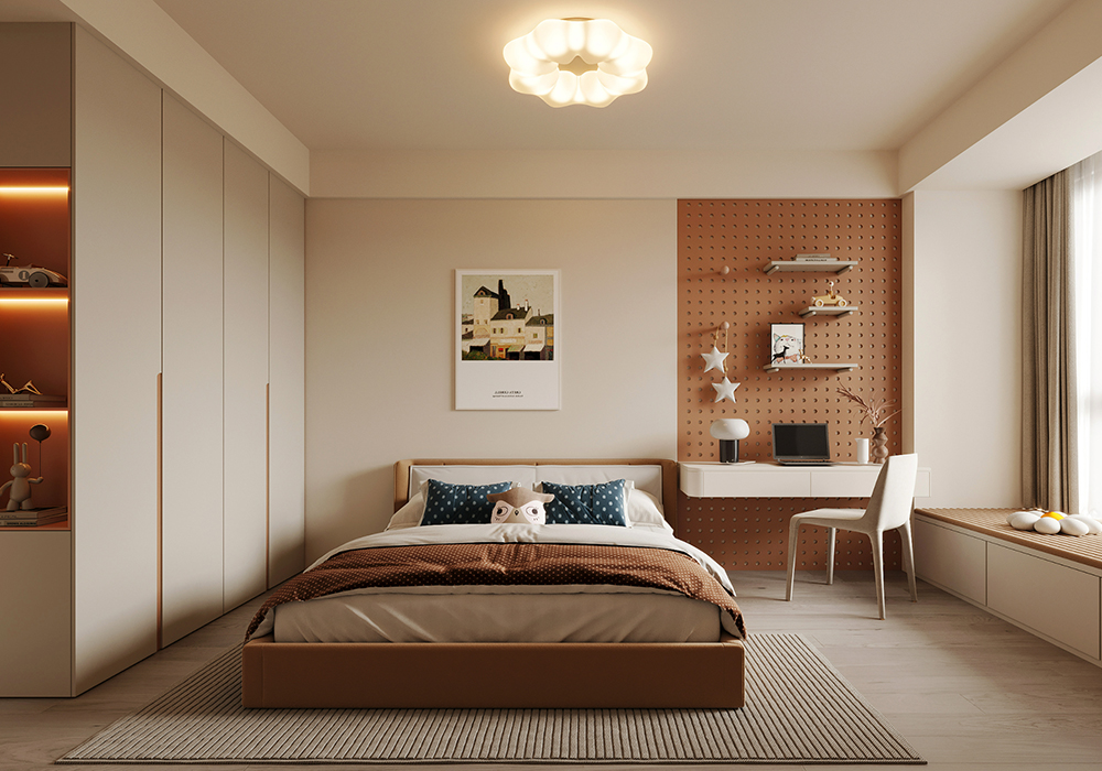 强调一种复古典雅、松弛惬意的格调,通过软装和灯光来烘托室内空间的氛围感和温馨感。根据不同业主的喜好,也逐渐和其他风格有了交叉,因要保留原本带的地暖,为不破坏地暖的排线,我们对于墙体没有做出太大的改变,保持原有户型。关于风格这个房间内就带了点法式线条灯盘这些,包括地板、家具的颜色,包括灯光都需要一点点调配 这样空间才会协调。