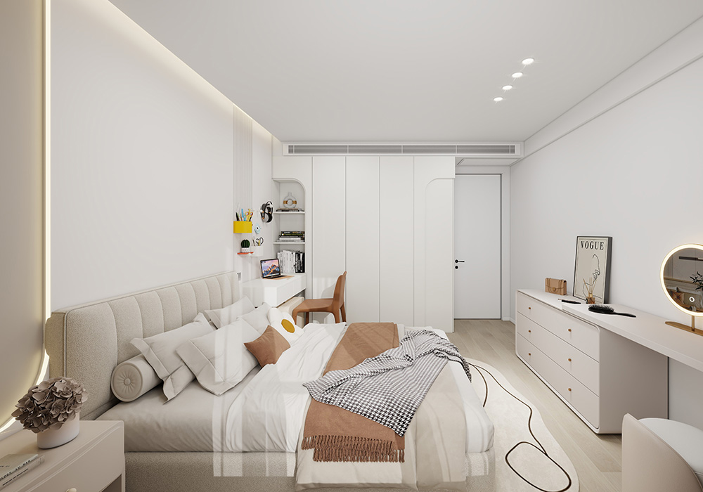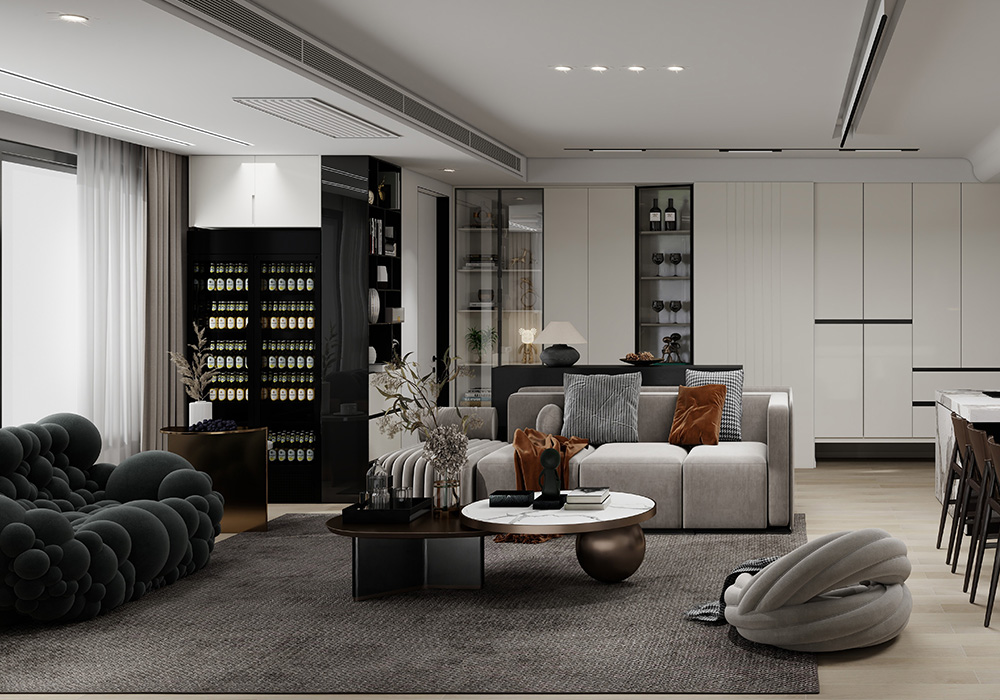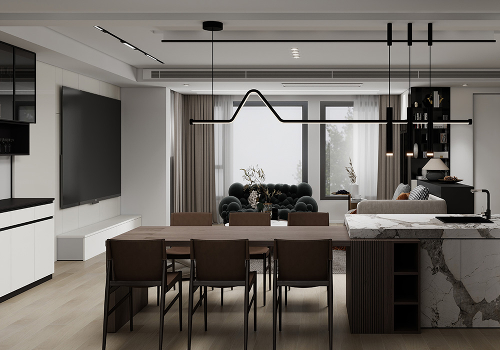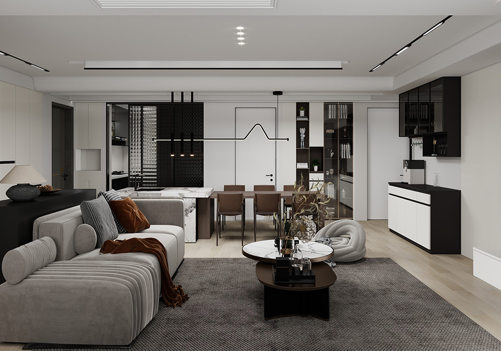 本案的户型方正,客餐厅宽敞,缺点是储物空间和动线规划不够合理,经过结构重组,客餐厅功能区规划更加分明,储物空间更加明确,整体色系采用白色,简约明亮,实用和美观并存。