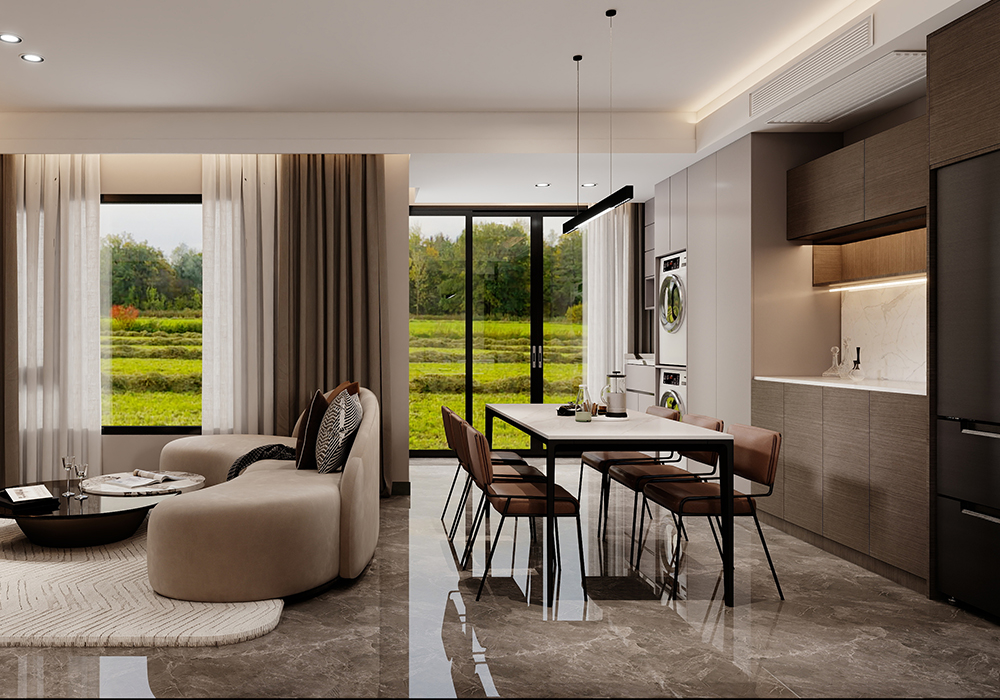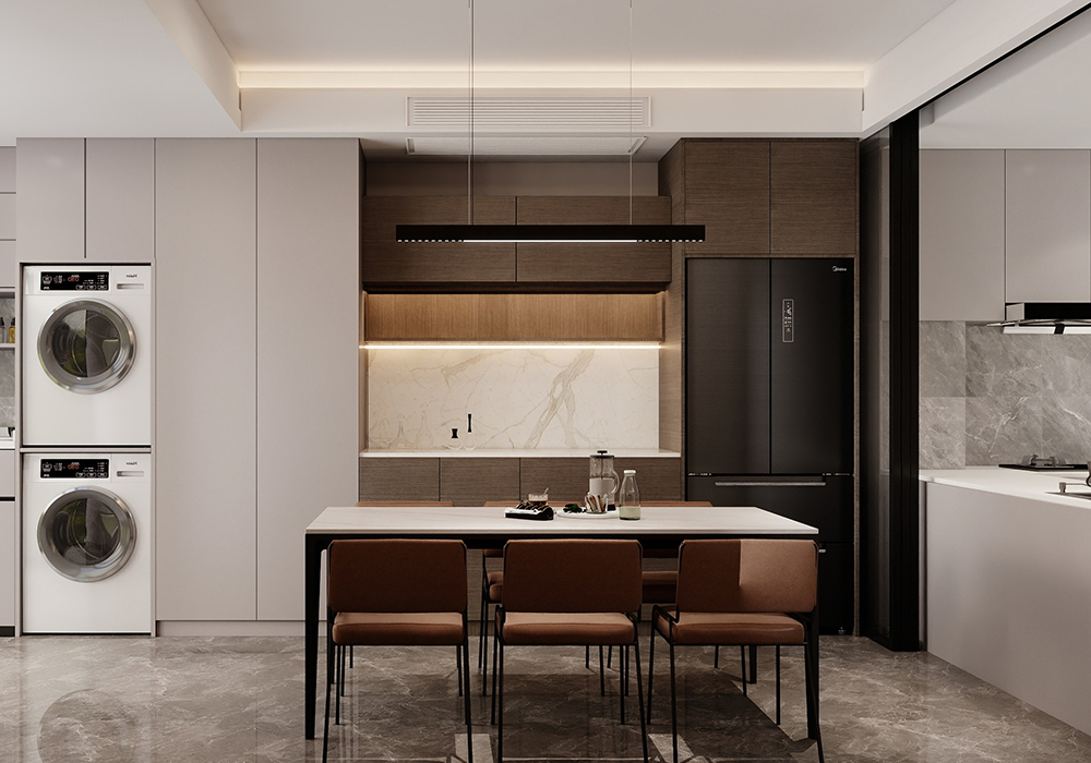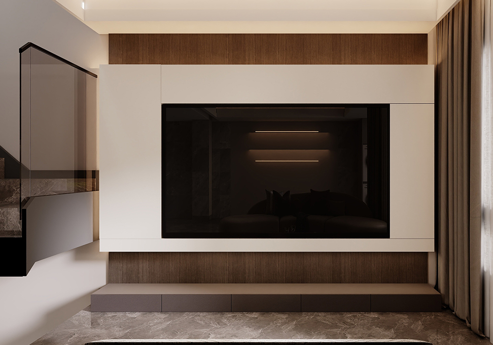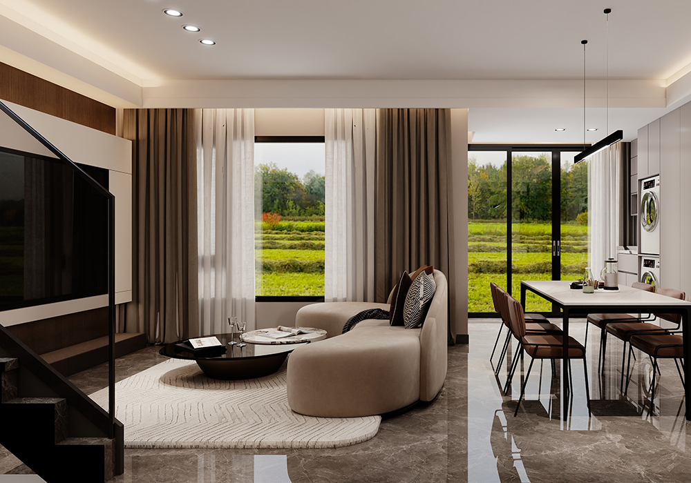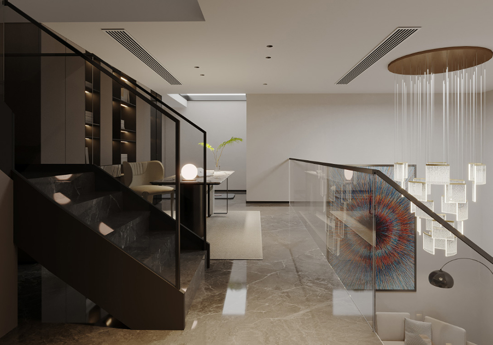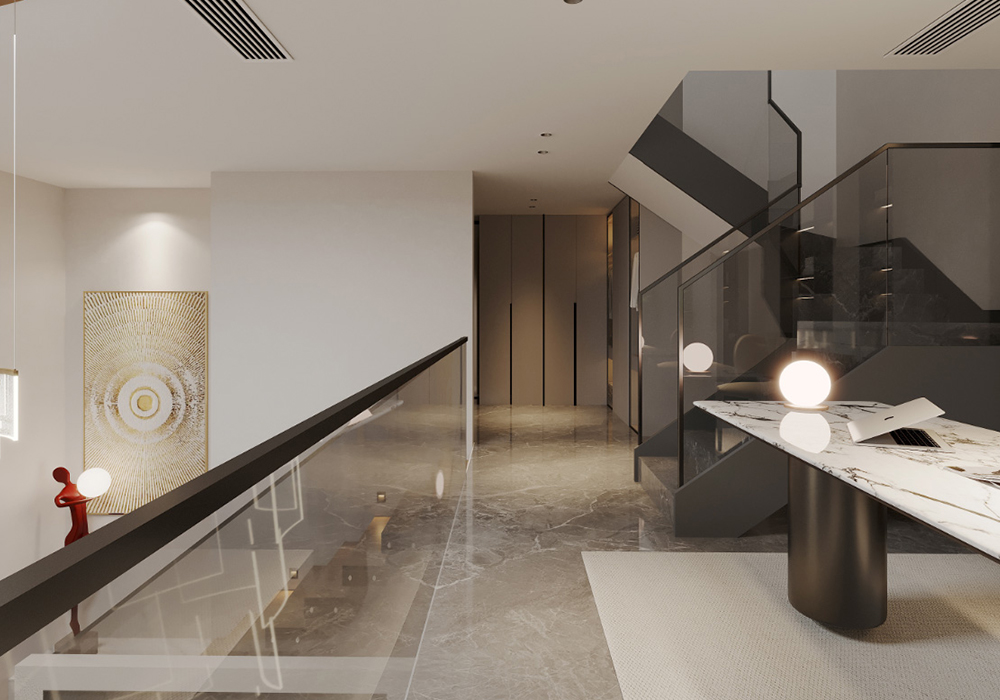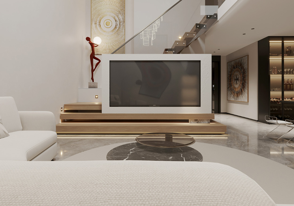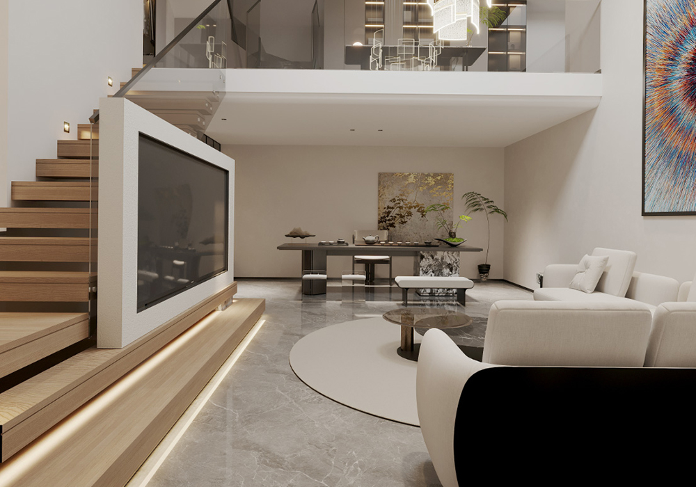 电视背景墙采用悬浮电视墙,下嵌入灯带的设计,起到视觉冲击力,高级又美观。横厅的结构,使整个客厅更加开阔大气。 餐厨一体的空间设计使得整个横厅连接起来,更增强了整个空间的整体性。地下室的设计中更改了楼梯位置,悬浮电视后面楼梯的设计方法,使得整个空间具有联结性,而保留一个挑空,浇筑一部分的空间,即保证了空间的利用率,也使得空间有开阔性。而灯光的设计,则是意式极简风格中的点睛之笔。它不仅仅是为了照明,更是为了营造氛围让居住者能在不同的光影交错中,感受到家的温馨与舒适。大到沙发茶几、小到壁灯、台灯、每个单品都是精心挑选,成为空间的点睛之笔,让空间瞬间灵动有趣起来。用现代设计语言诠释家的品味与舒适。美观与实用并存,简约线条诉说空间的故事,每一外细节都充满生命力。