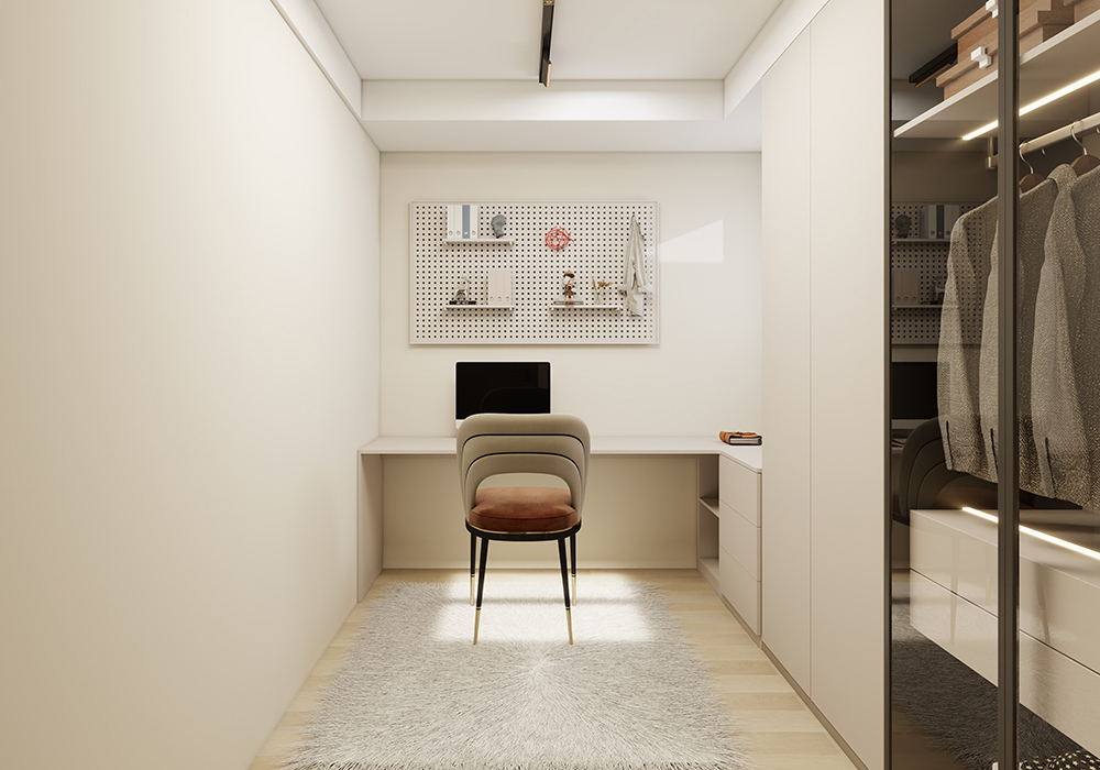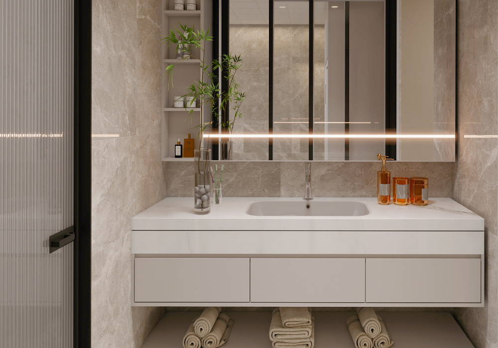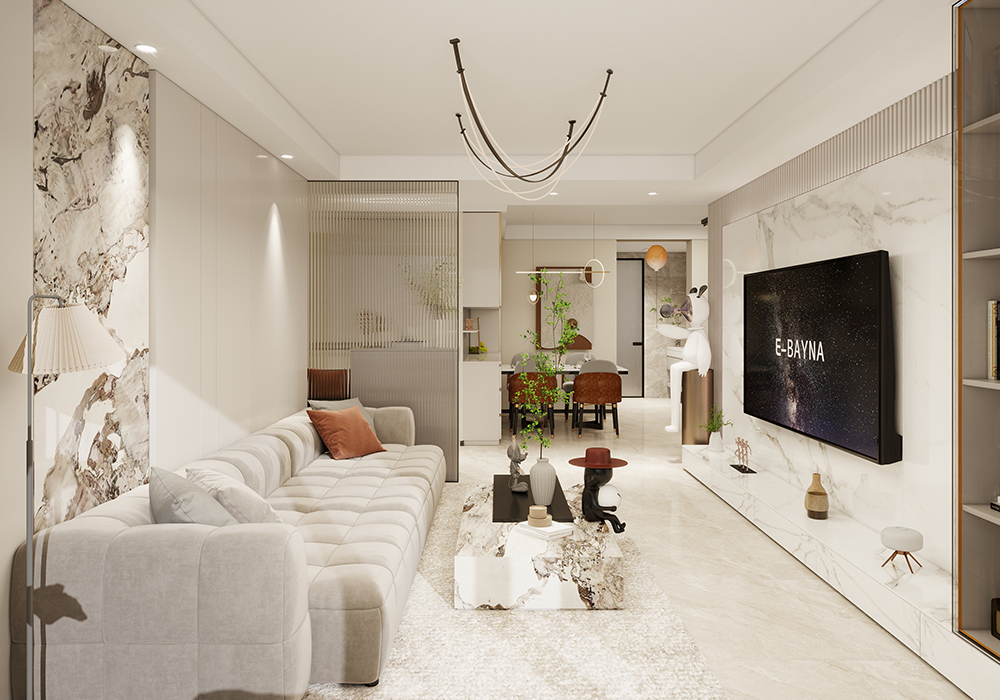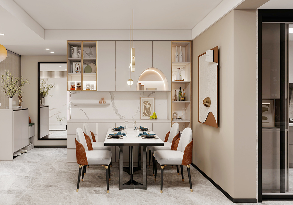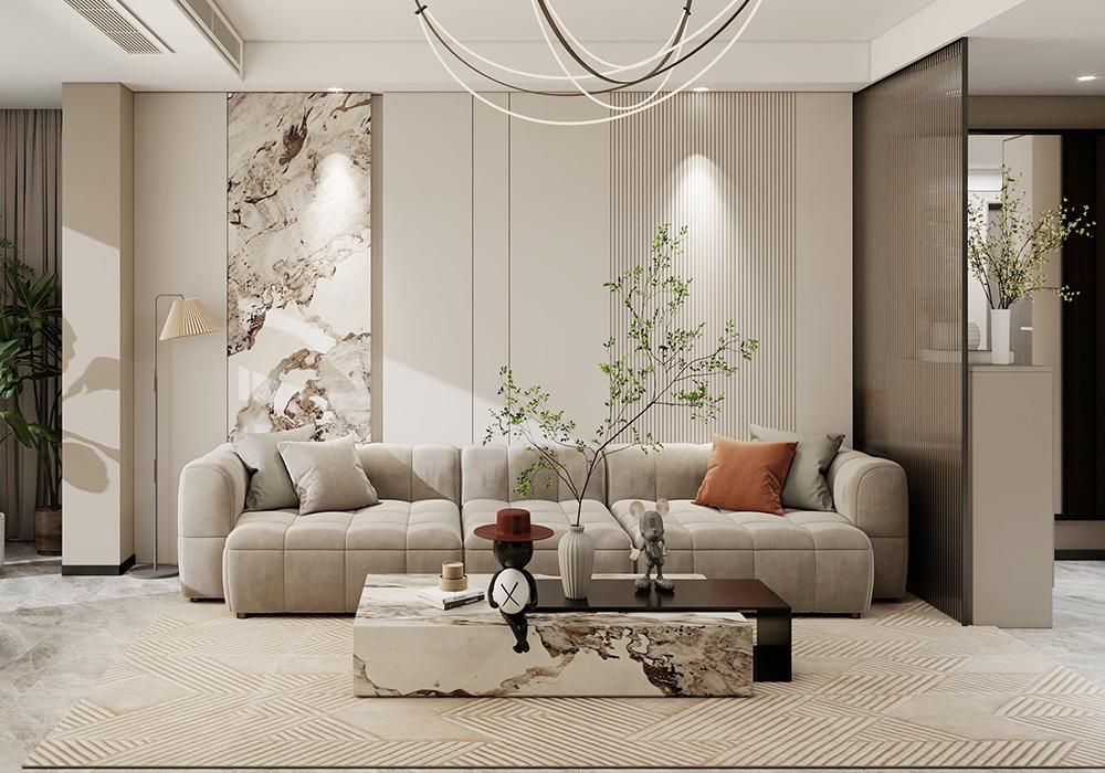 大理石、金属、玻璃等硬质材料也仿佛镀上一层暖光, 柔和而不失温度,毫无冷峻之感。 简质的线条,考究的用材,大平层的通透感, 每一处细节都散发着淡然愉悦的轻奢韵味, 整个居所洋溢着明快活泼的气息,更不失奢雅格调。