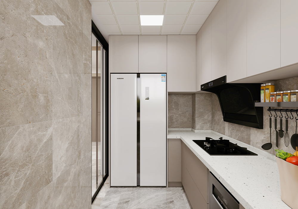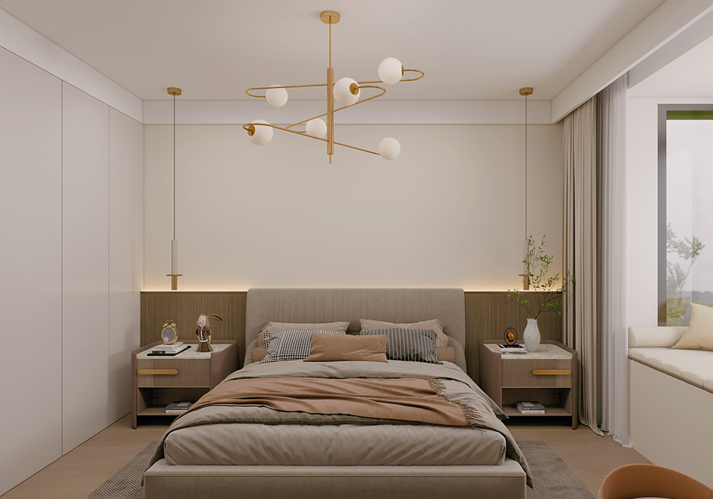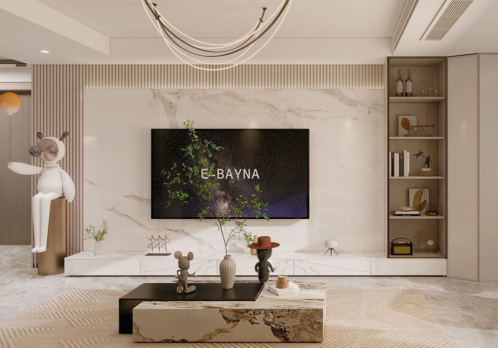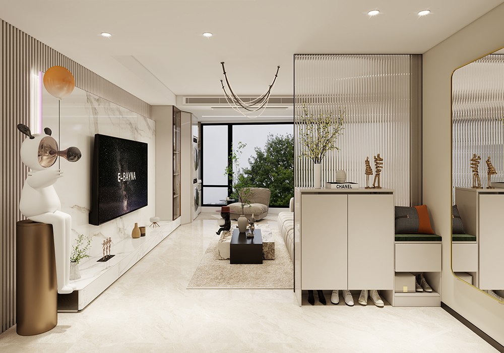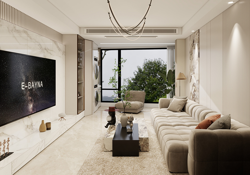 大理石、金属、玻璃等硬质材料也仿佛镀上一层暖光, 柔和而不失温度,毫无冷峻之感。 简质的线条,考究的用材,大平层的通透感, 每一处细节都散发着淡然愉悦的轻奢韵味, 整个居所洋溢着明快活泼的气息,更不失奢雅格调。
