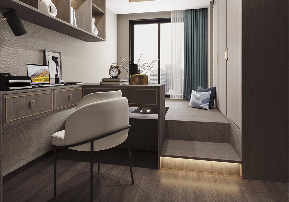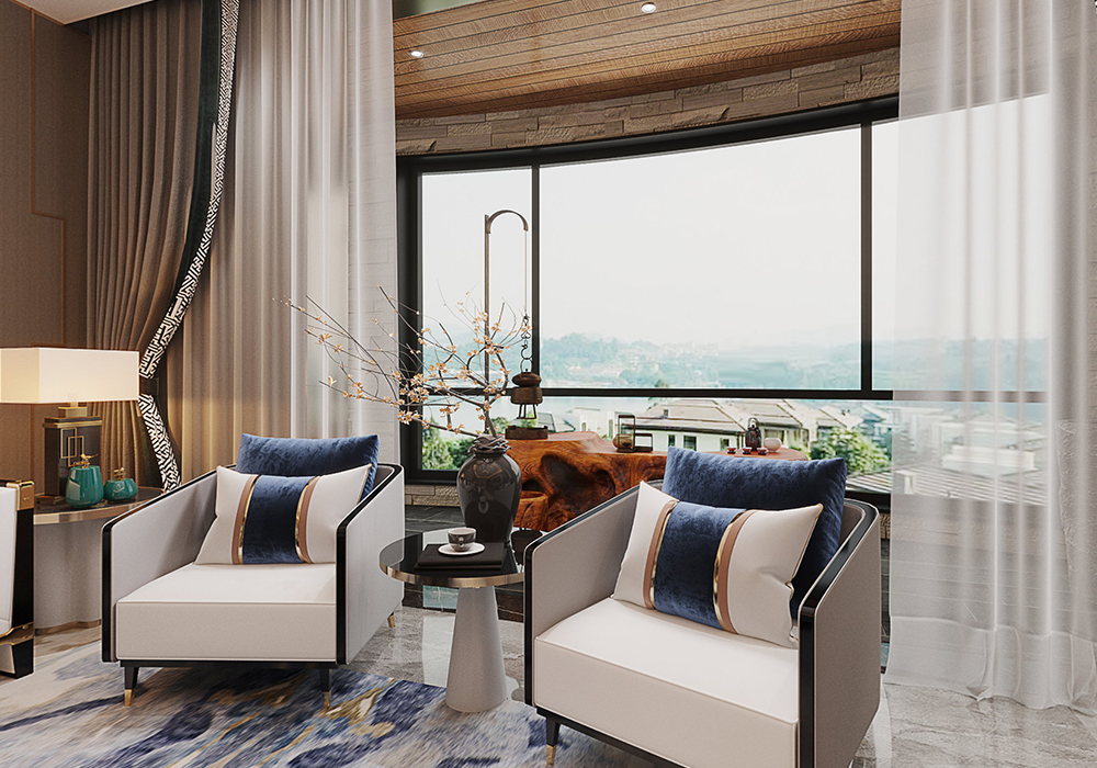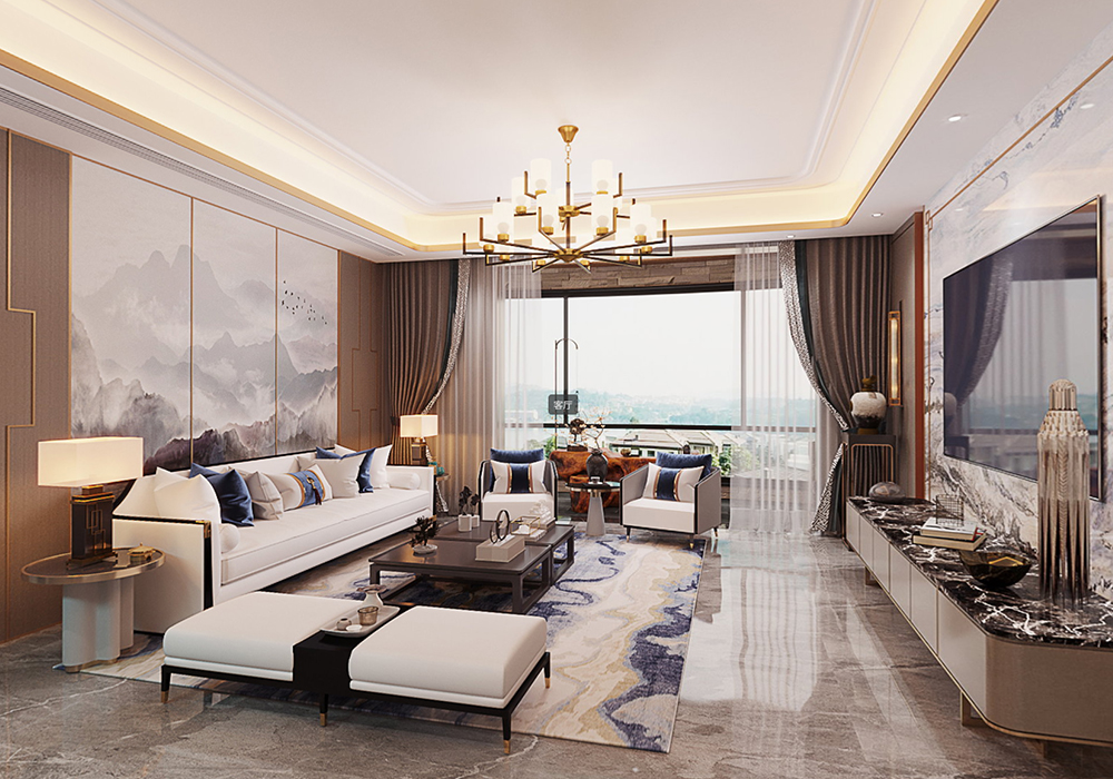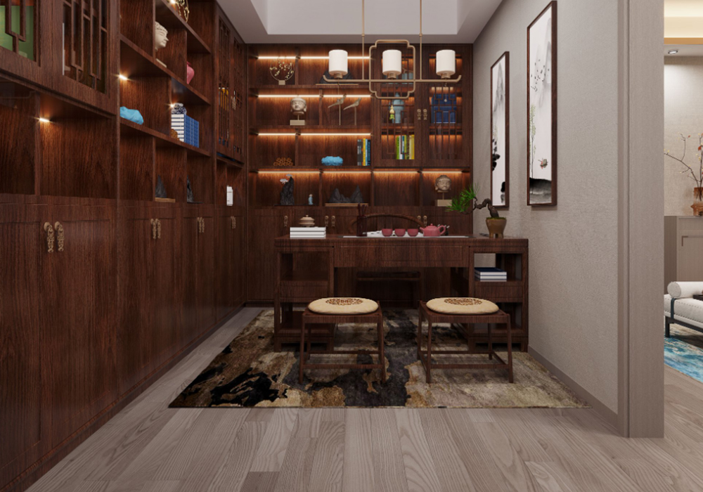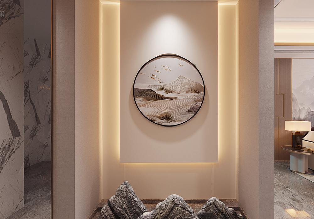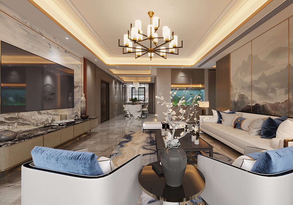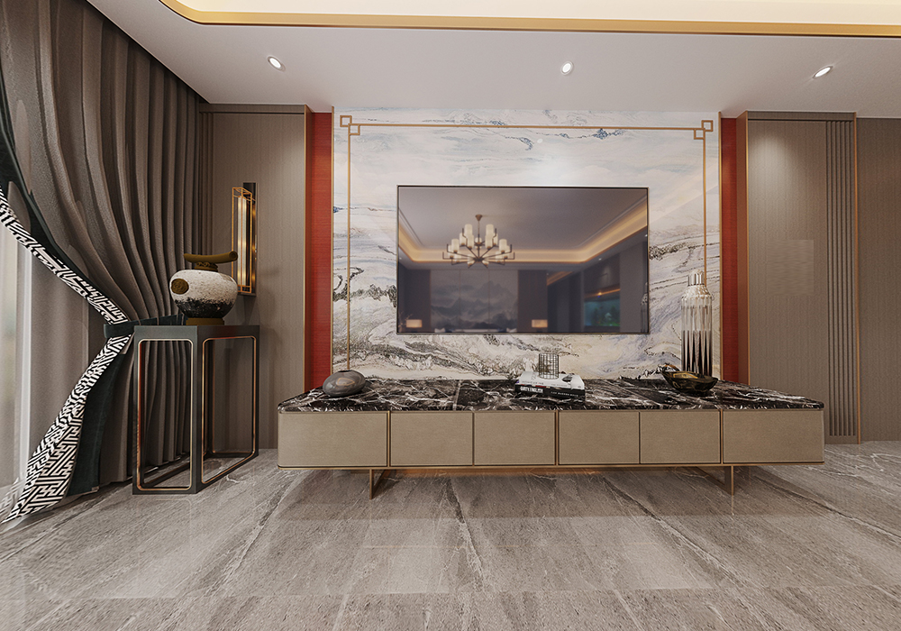 本案以新中式为基调,在大平层空间中演绎大气磅礴的东方美学。 客厅是核心区域:大理石电视背景墙以水墨纹理呼应中式意境,搭配木饰面隐形门,将储物间与空间巧妙融合;软包浮绣沙发背景墙用米白绣线勾勒山水纹样,与实木沙发形成软硬对比。全屋采用中央空调,配合无主灯设计,光线柔和且不破坏顶面整体性。 阳台引入自然园林元素,仿古砖地面铺设出曲折路径,角落置一方鱼缸,水流与假山造景相映,搭配竹制格栅隔断,宛如室内微缩园林。 细节处暗藏巧思:仿古砖通铺客餐厅,温润质感平衡石材的冷硬;厨卫配备热水器零冷水系统,提升使用舒适度。整体以木色、米白为基础色调,通过金属线条点缀,既保留中式的沉稳雅致,又以现代工艺消解传统形制的厚重,让东方韵味与当代生活需求自然契合。