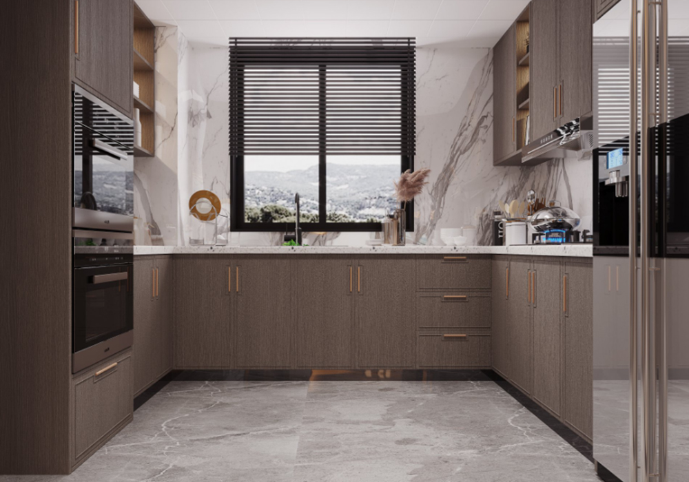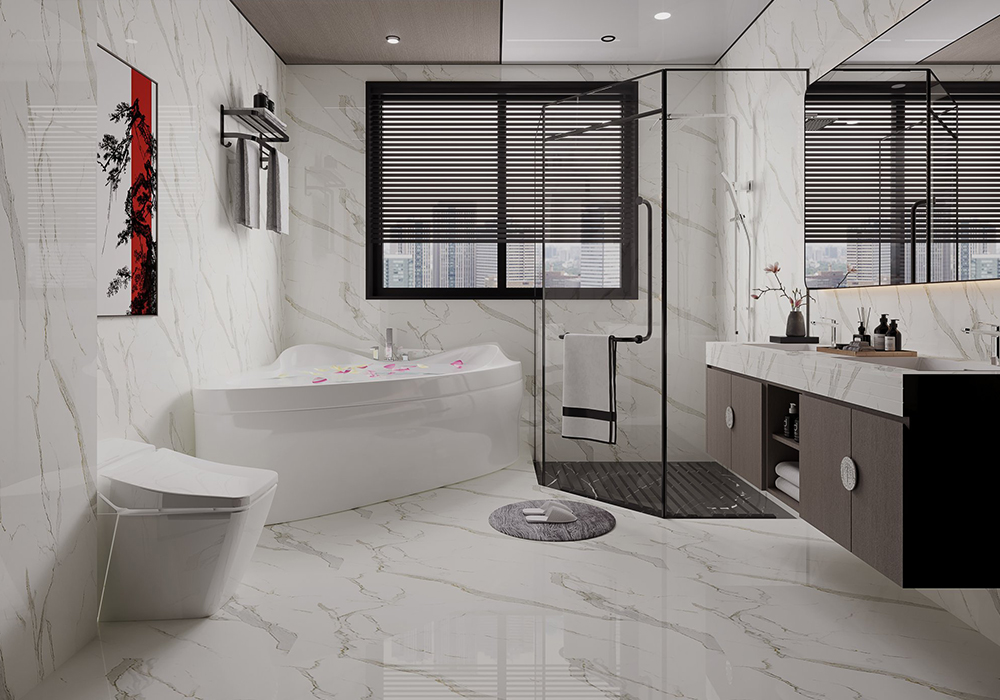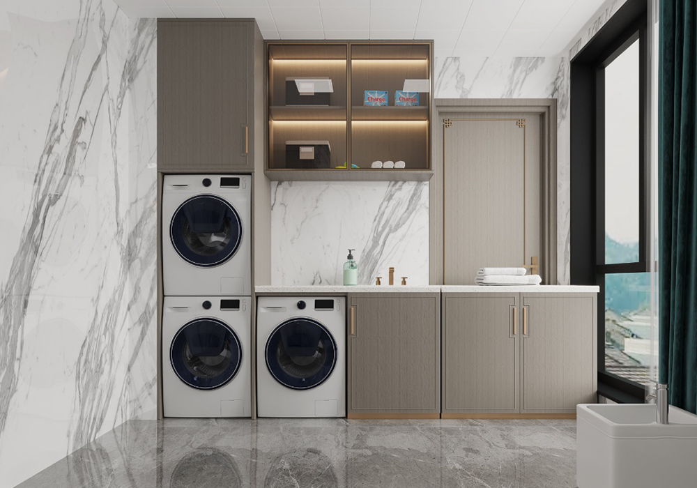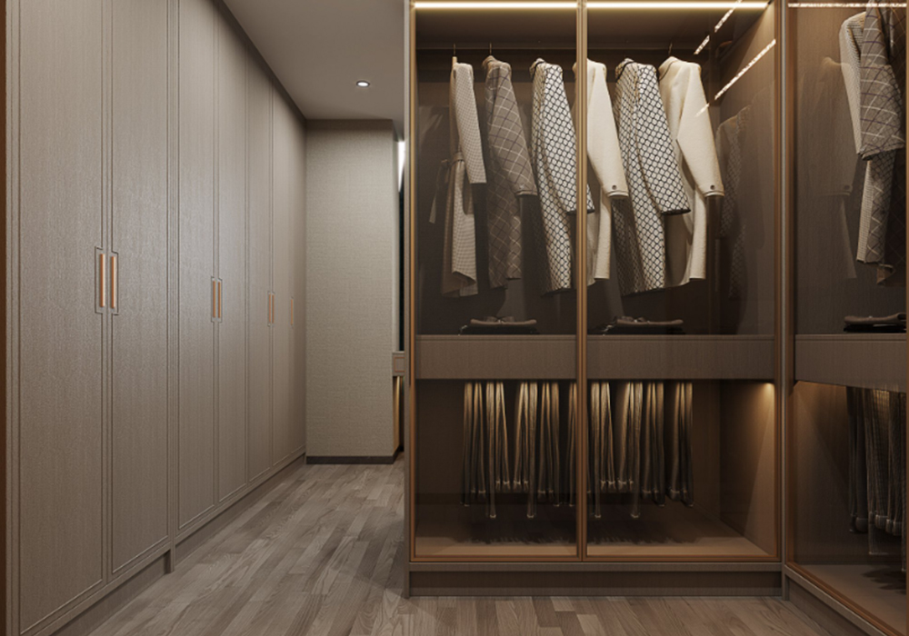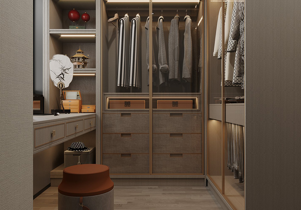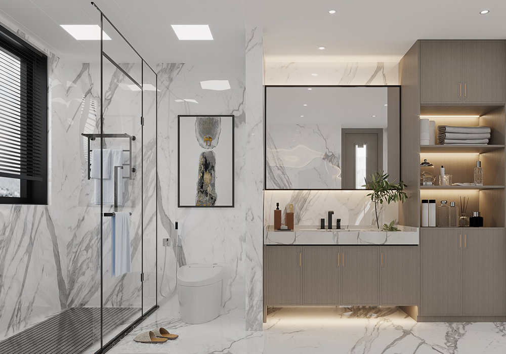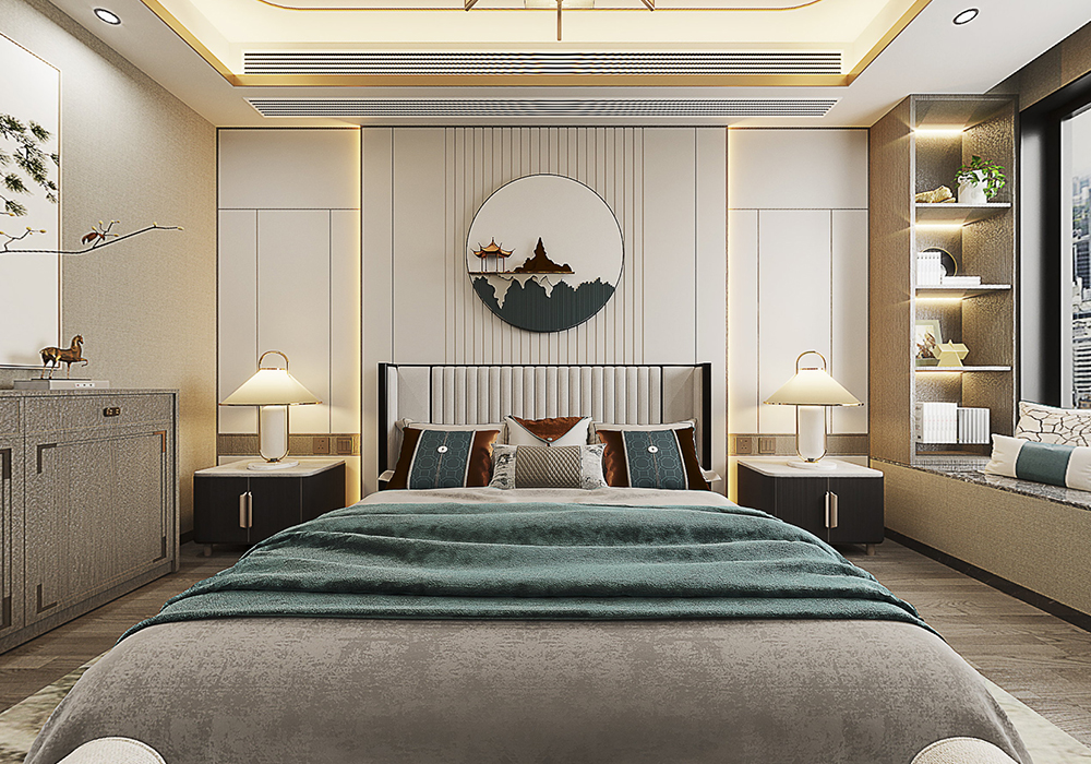 本案以新中式为基调,在大平层空间中演绎大气磅礴的东方美学。 客厅是核心区域:大理石电视背景墙以水墨纹理呼应中式意境,搭配木饰面隐形门,将储物间与空间巧妙融合;软包浮绣沙发背景墙用米白绣线勾勒山水纹样,与实木沙发形成软硬对比。全屋采用中央空调,配合无主灯设计,光线柔和且不破坏顶面整体性。 阳台引入自然园林元素,仿古砖地面铺设出曲折路径,角落置一方鱼缸,水流与假山造景相映,搭配竹制格栅隔断,宛如室内微缩园林。 细节处暗藏巧思:仿古砖通铺客餐厅,温润质感平衡石材的冷硬;厨卫配备热水器零冷水系统,提升使用舒适度。整体以木色、米白为基础色调,通过金属线条点缀,既保留中式的沉稳雅致,又以现代工艺消解传统形制的厚重,让东方韵味与当代生活需求自然契合。