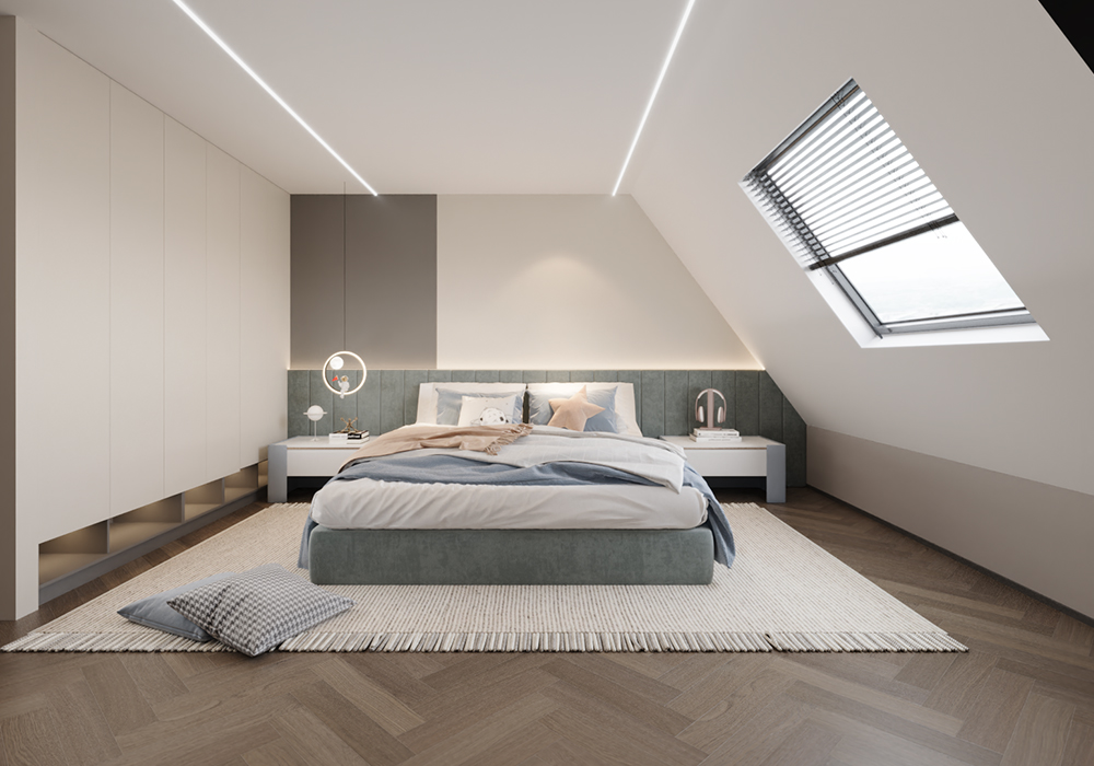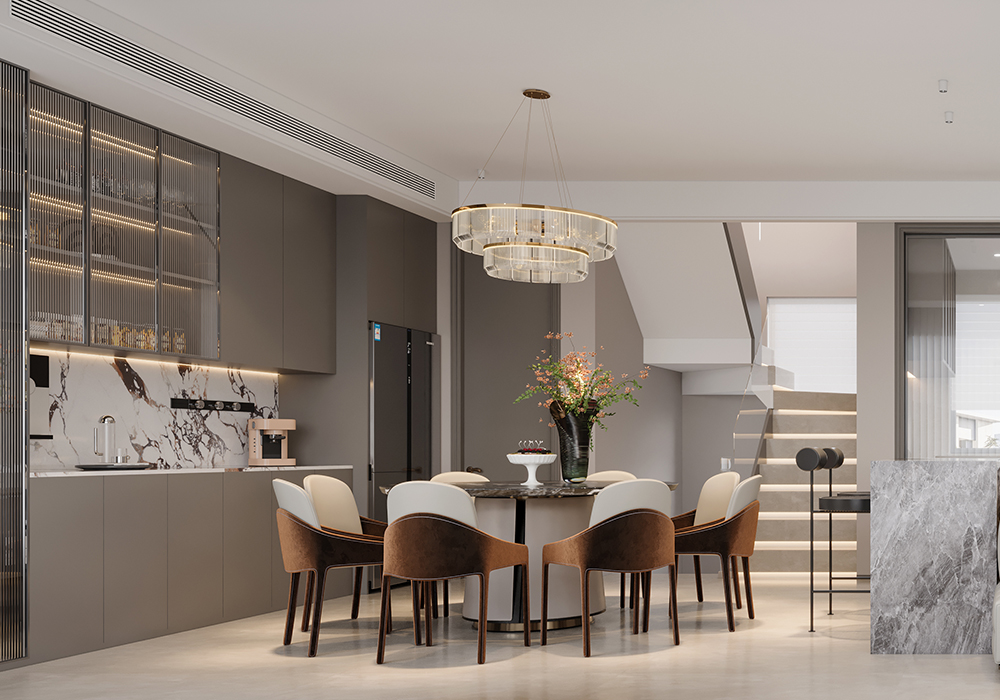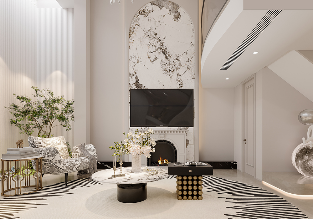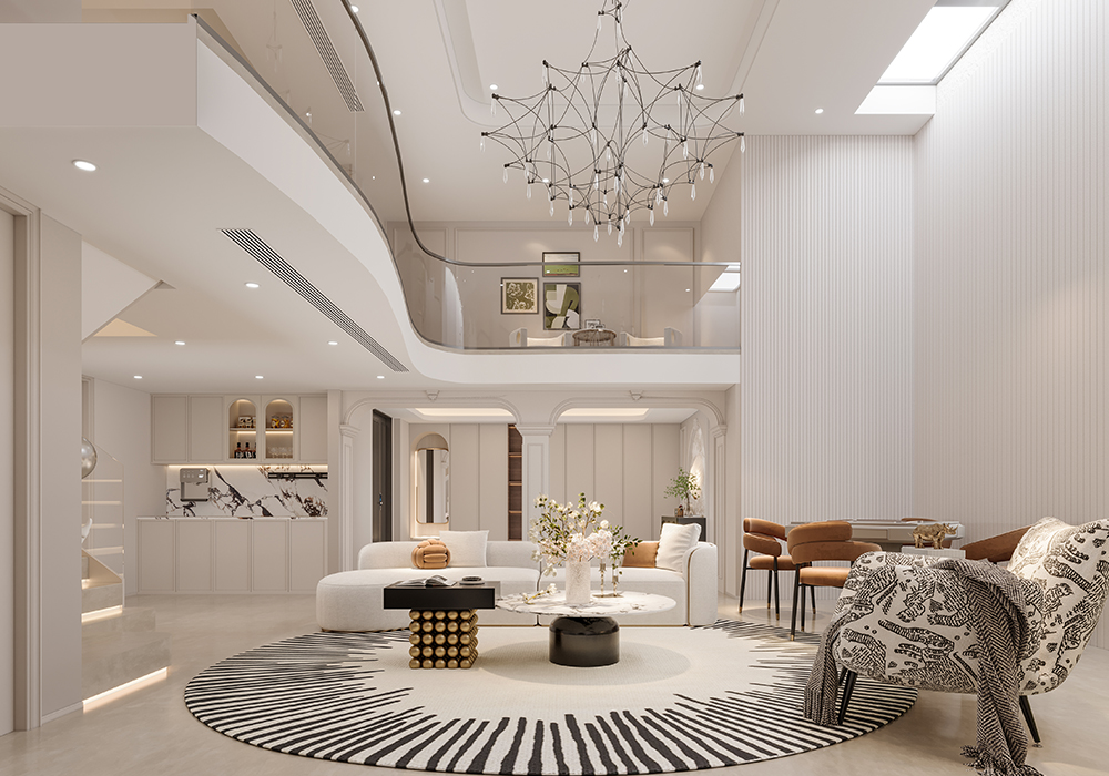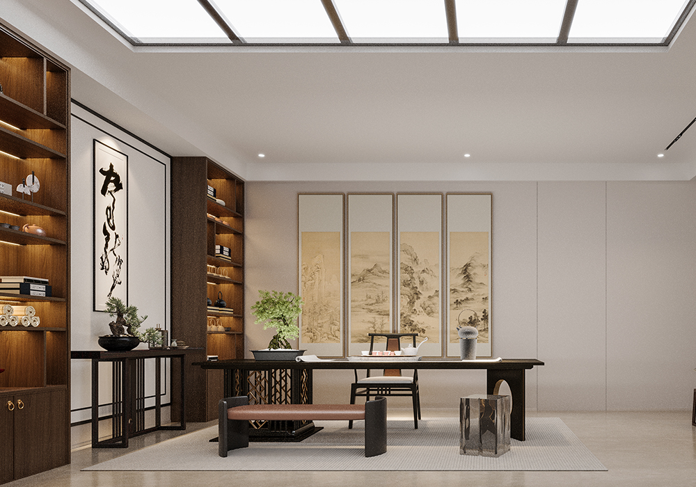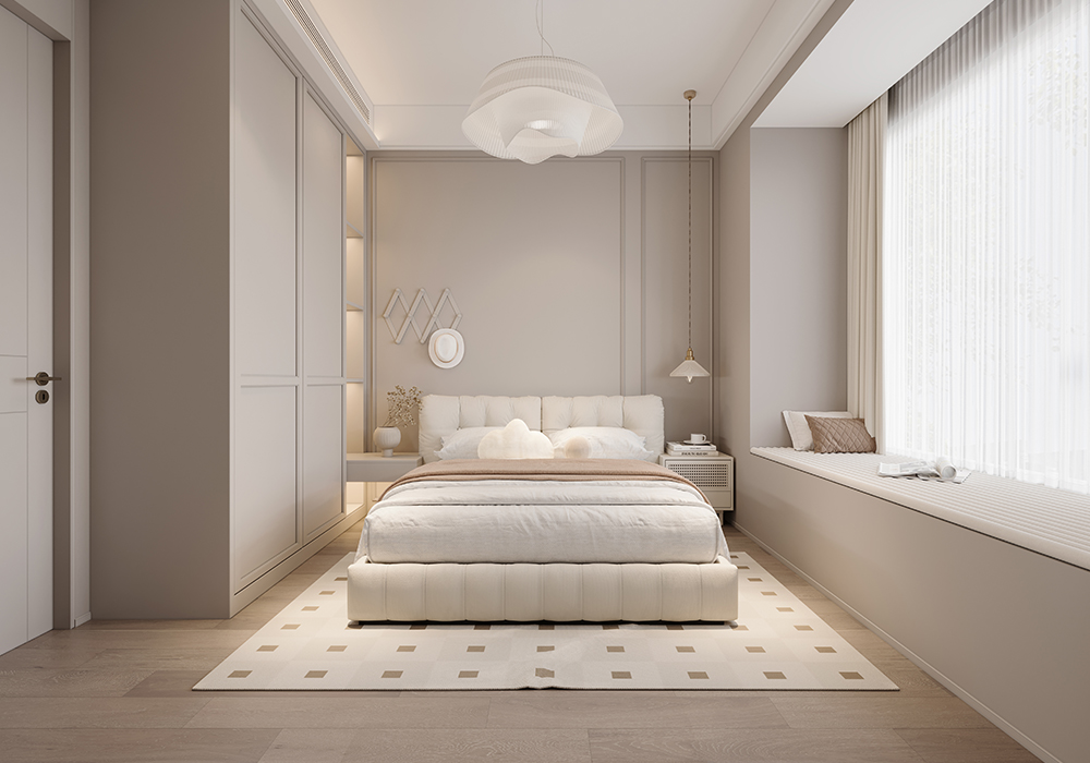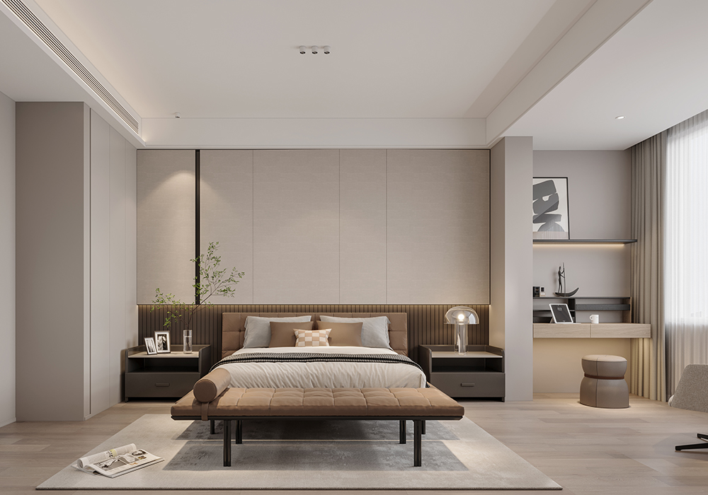 墙面、隔断的弧形设计,似传统月洞门意象,柔化空间边界,营造含蓄、迂回的中式空间层次。陈设上,少量中式意境摆件(如简约花艺、新中式雕塑)点缀,替代传统繁重装饰,以 “少而精” 传递东方意韵,契合现代简约需求。卧室空间:主卧追求 “静雅私密”,延续整体浅暖色调,搭配简约中式线条的背景墙、柜体,灯光设计模拟传统书房 “案头清光” 的氛围,营造静谧休憩环境。儿童房以童趣化中式元素(如山水、星空主题墙绘),将中式意境转化为孩子能感知的探索空间,传承文化同时贴合成长需求。